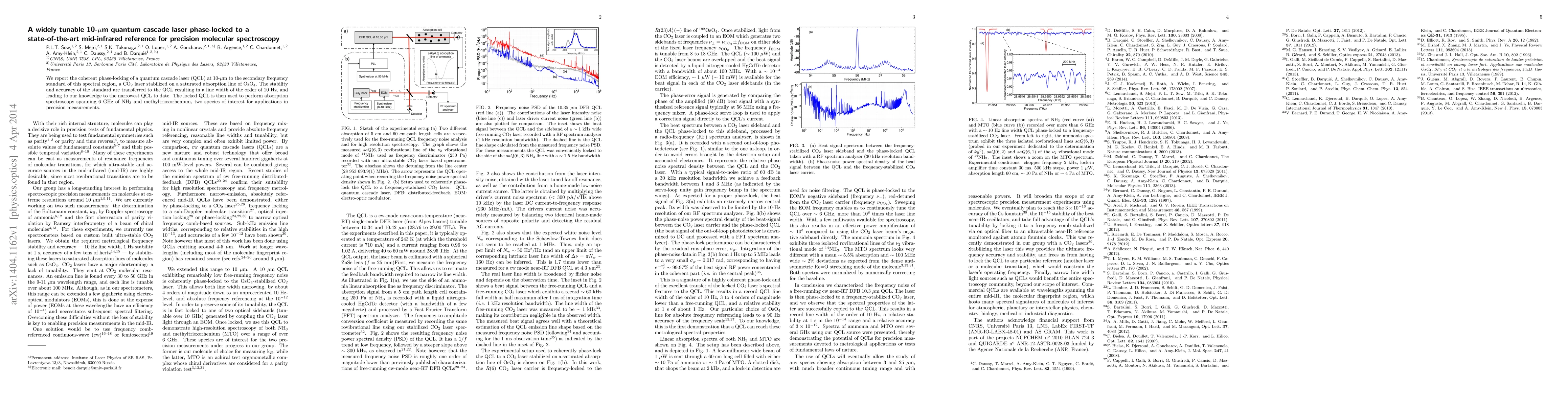 This paper presents a phase-locked 10-µm quantum cascade laser to a CO2 laser reference, achieving a line width of 10 Hz, the narrowest reported to date. The precision laser enables high-resolution absorption spectroscopy of NH3 and methyltrioxorhenium for applications in precision measurements.