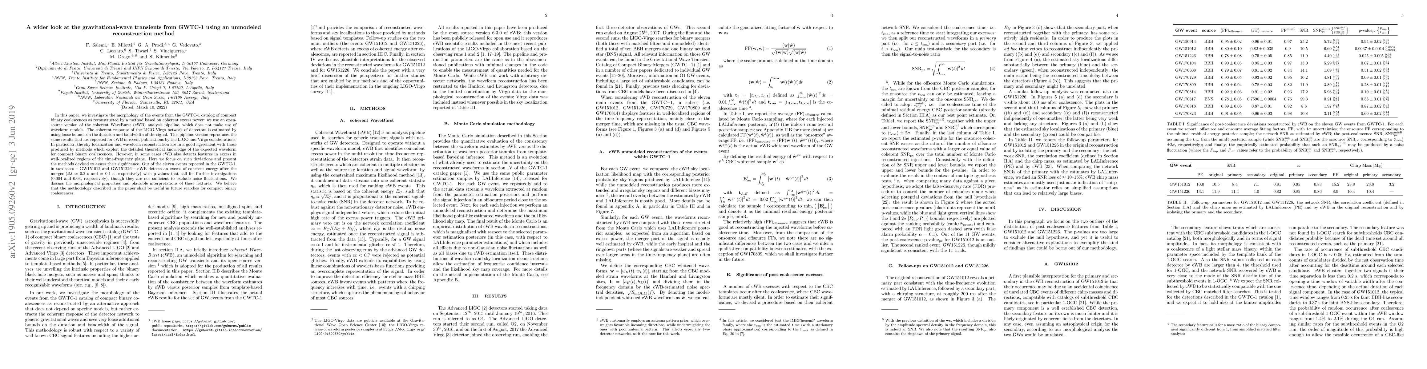 This study uses an unmodeled reconstruction method to analyze gravitational-wave signals from the GWTC-1 catalog, finding potential excess energy features in two events, GW151012 and GW151226, that warrant further investigation, with p-values of 0.004 and 0.03 respectively. The methodology focuses on coherent excess power and loose bounds on signal duration and bandwidth.