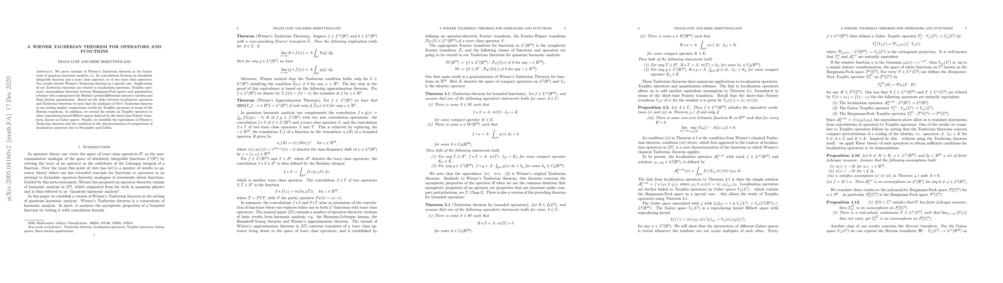 We prove variants of Wiener's Tauberian theorem in the framework of quantum harmonic analysis, i.e. for convolutions between an absolutely integrable function and a trace class operator, or of two trace class operators. Our results include Wiener's Tauberian theorem as a special case. Applications of our Tauberian theorems are related to localization operators, Toeplitz operators, isomorphism theorems between Bargmann-Fock spaces and quantization schemes with consequences for Shubin's pseudodifferential operator calculus and Born-Jordan quantization. Based on the links between localization operators and Tauberian theorems we note that the analogue of Pitt's Tauberian theorem in our setting implies compactness results for Toeplitz operators in terms of the Berezin transform. In addition, we extend the results on Toeplitz operators to other reproducing kernel Hilbert spaces induced by the short-time Fourier transform, known as Gabor spaces. Finally, we establish the equivalence of Wiener's Tauberian theorem and the condition in the characterization of compactness of localization operators due to Fern\'andez and Galbis.