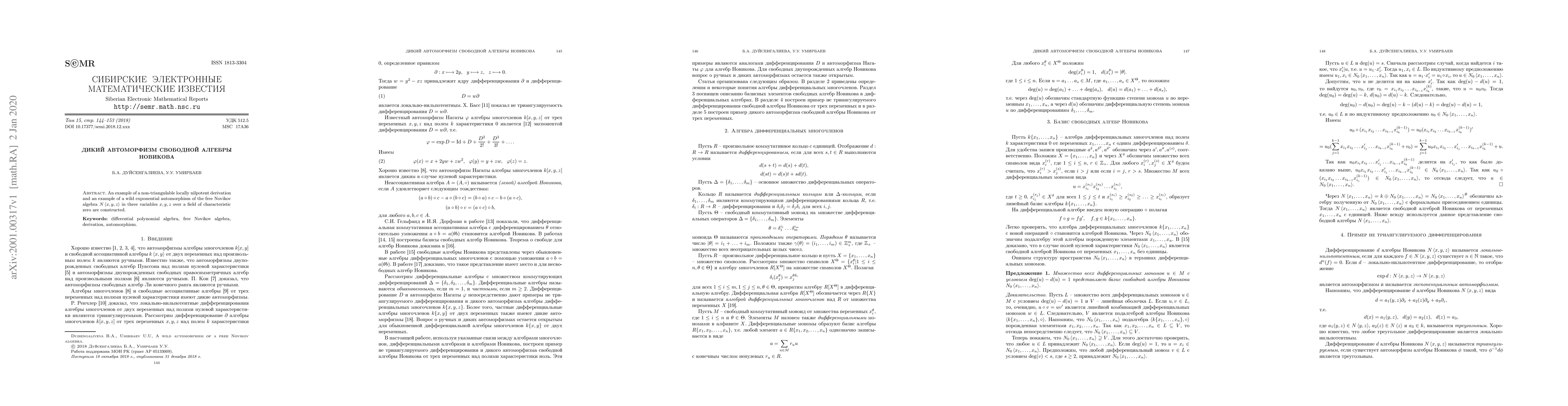 An example of a non-triangulable locally nilpotent derivation and an example of a wild exponential automorphism of the free Novikov algebra $N\left\langle x,y,z\right\rangle$ in three variables $x,y,z$ over a field of characteristic zero are constructed.