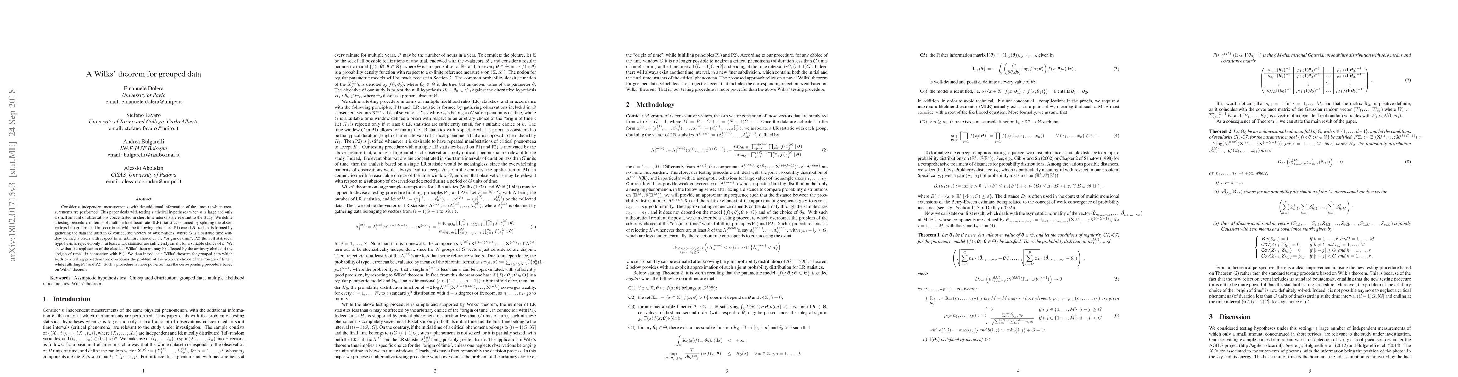 Consider $n$ independent measurements, with the additional information of the times at which measurements are performed. This paper deals with testing statistical hypotheses when $n$ is large and only a small amount of observations concentrated in short time intervals are relevant to the study. We define a testing procedure in terms of multiple likelihood ratio (LR) statistics obtained by splitting the observations into groups, and in accordance with the following principles: P1) each LR statistic is formed by gathering the data included in $G$ consecutive vectors of observations, where $G$ is a suitable time window defined a priori with respect to an arbitrary choice of the `origin of time'; P2) the null statistical hypothesis is rejected only if at least $k$ LR statistics are sufficiently small, for a suitable choice of $k$. We show that the application of the classical Wilks' theorem may be affected by the arbitrary choice of the "origin of time", in connection with P1). We then introduce a Wilks' theorem for grouped data which leads to a testing procedure that overcomes the problem of the arbitrary choice of the `origin of time', while fulfilling P1) and P2). Such a procedure is more powerful than the corresponding procedure based on Wilks' theorem.