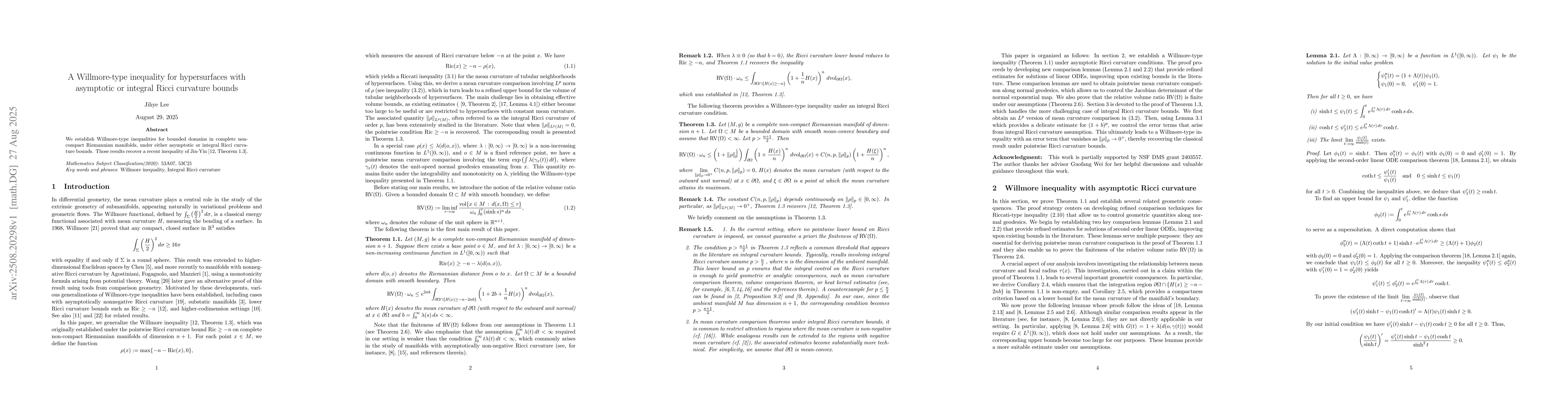 We establish Willmore-type inequalities for bounded domains in complete non-compact Riemannian manifolds, under either asymptotic or integral Ricci curvature bounds. Those results recover a recent inequality of Jin-Yin arXiv:2402.02465.