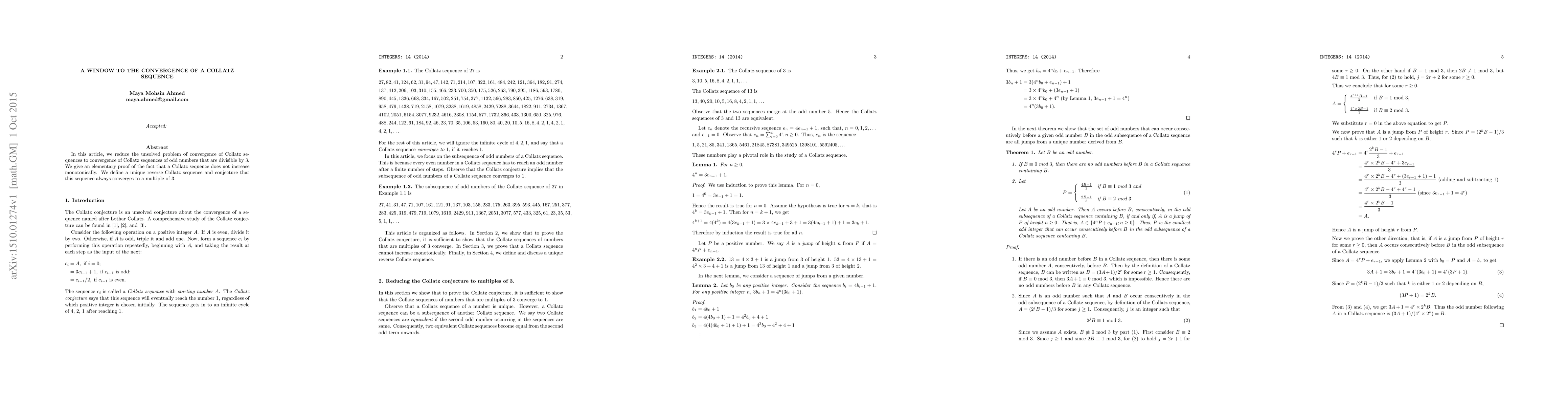 In this article, we reduce the unsolved problem of convergence of Collatz sequences to convergence of Collatz sequences of odd numbers that are divisible by 3. We give an elementary proof of the fact that a Collatz sequence does not increase monotonically. We define a unique reverse Collatz sequence and conjecture that this sequence always converges to a multiple of $3$.