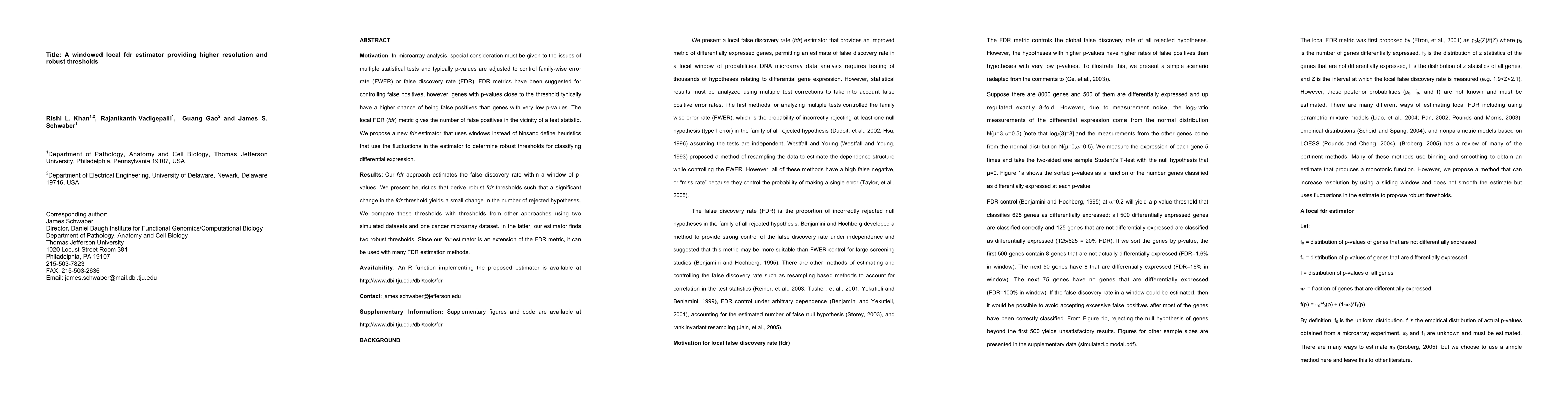 Motivation: In microarray analysis, special consideration must be given to the issues of multiple statistical tests and typically p-values are adjusted to control family-wise error rate (FWER) or false discovery rate (FDR). FDR metrics have been suggested for controlling false positives, however, genes with p-values close to the threshold typically have a higher chance of being false positives than genes with very low p-values. The local FDR (fdr) metric gives the number of false positives in the vicinity of a test statistic. We propose a new fdr estimator that uses windows instead of binsand define heuristics that use the fluctuations in the estimator to determine robust thresholds for classifying differential expression. Results: Our fdr approach estimates the false discovery rate within a window of p-values. We present heuristics that derive robust fdr thresholds such that a significant change in the fdr threshold yields a small change in the number of rejected hypotheses. We compare these thresholds with thresholds from other approaches using two simulated datasets and one cancer microarray dataset. In the latter, our estimator finds two robust thresholds. Since our fdr estimator is an extension of the FDR metric, it can be used with many FDR estimation methods. Availability: An R function implementing the proposed estimator is available at http://www.dbi.tju.edu/dbi/tools/fdr Contact: [email protected] Supplementary Information: Supplementary figures and code are available at http://www.dbi.tju.edu/dbi/tools/fdr