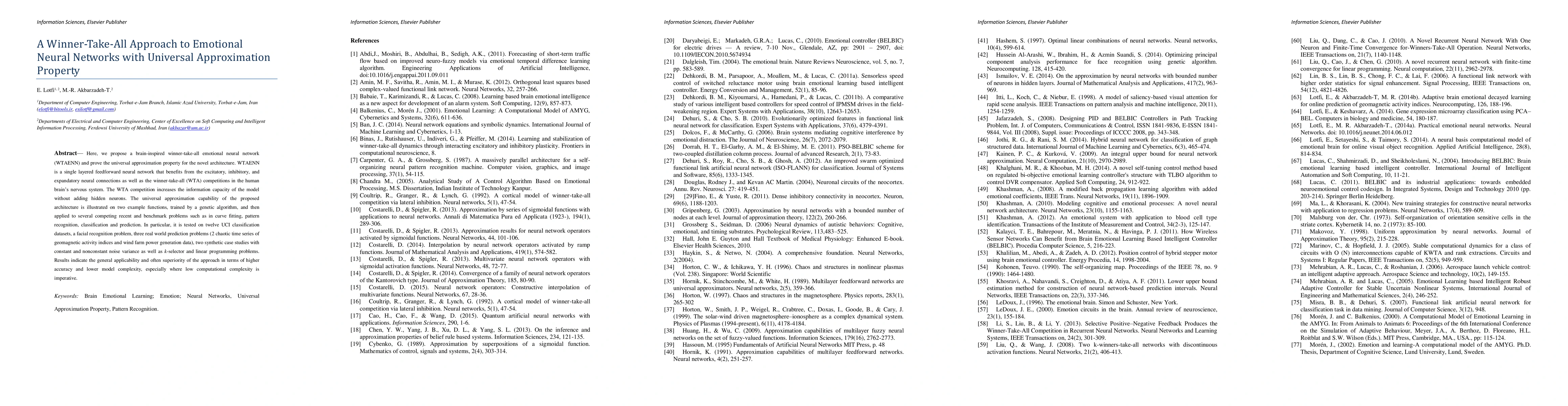 This paper introduces a novel brain-inspired winner-take-all emotional neural network (WTAENN) with a universal approximation property, demonstrating its effectiveness through various applications including classification, pattern recognition, and prediction. The model's success is attributed to its unique architecture leveraging WTA competitions and minimal computational complexity.
