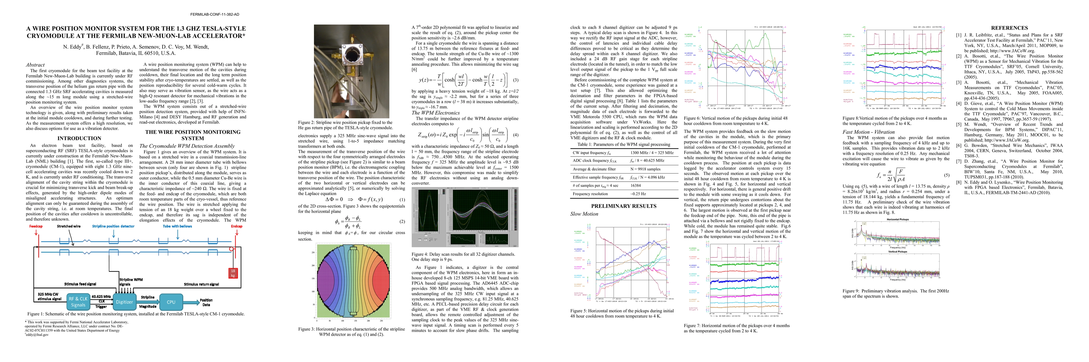 The first cryomodule for the beam test facility at the Fermilab New-Muon-Lab building is currently under RF commissioning. Among other diagnostics systems, the transverse position of the helium gas return pipe with the connected 1.3 GHz SRF accelerating cavities is measured along the ~15 m long module using a stretched-wire position monitoring system. An overview of the wire position monitor system technology is given, along with preliminary results taken at the initial module cool down, and during further testing. As the measurement system offers a high resolution, we also discuss options for use as a vibration detector.