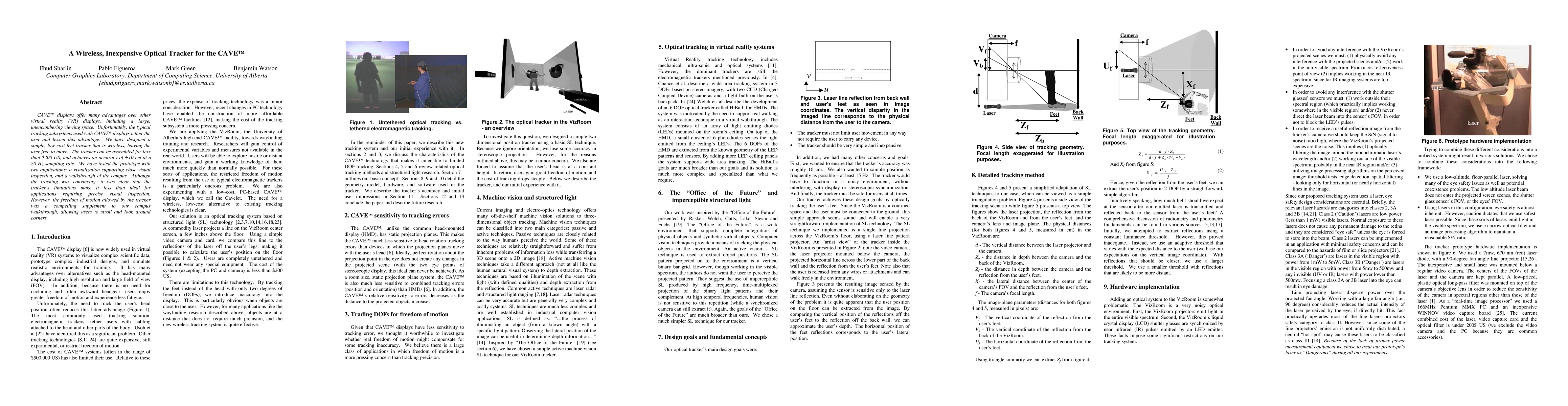 The research describes the design and implementation of a wireless, inexpensive optical tracker for CAVE (Cave Automatic Virtual Environment) displays, focusing on tracking user's feet for whole-body movement support in virtual reality applications.