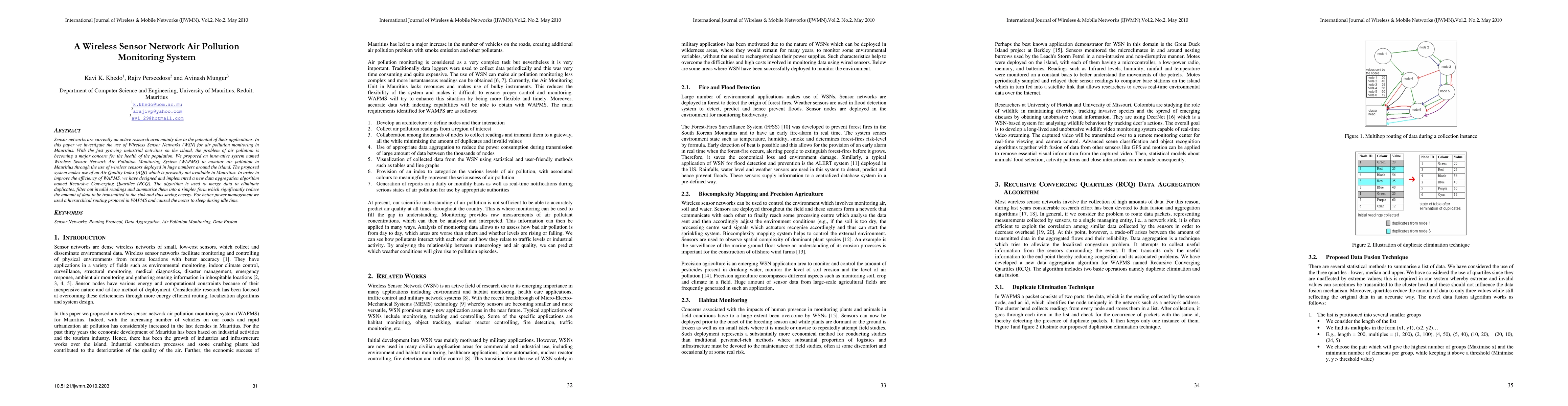 This paper proposes a Wireless Sensor Network Air Pollution Monitoring System (WAPMS) to address air pollution in Mauritius, employing a new data aggregation algorithm and hierarchical routing protocol to enhance efficiency and conserve energy. The system aims to provide an Air Quality Index (AQI) absent in Mauritius, utilizing wireless sensors deployed across the island.