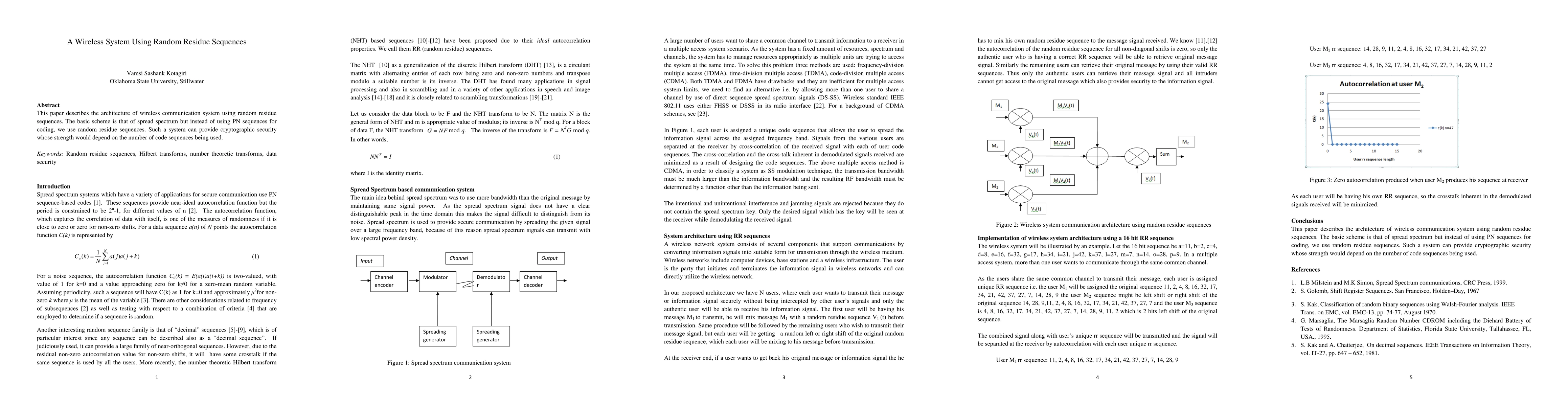 This paper proposes a wireless communication system based on spread spectrum using random residue sequences instead of PN sequences for coding, offering cryptographic security strength proportional to the number of code sequences employed.