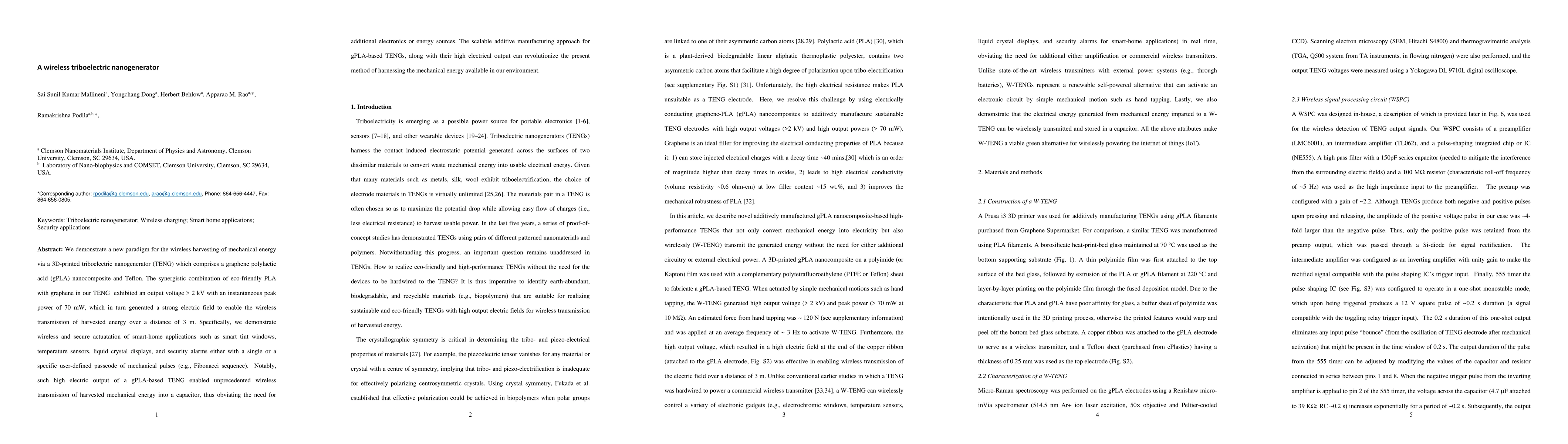 This paper presents a 3D-printed triboelectric nanogenerator (TENG) utilizing graphene-enhanced polylactic acid (gPLA) and Teflon, achieving high output voltage and power for wireless energy transmission. The device enables wireless actuation of smart-home applications without additional electronics, showcasing a scalable, eco-friendly approach to mechanical energy harvesting.