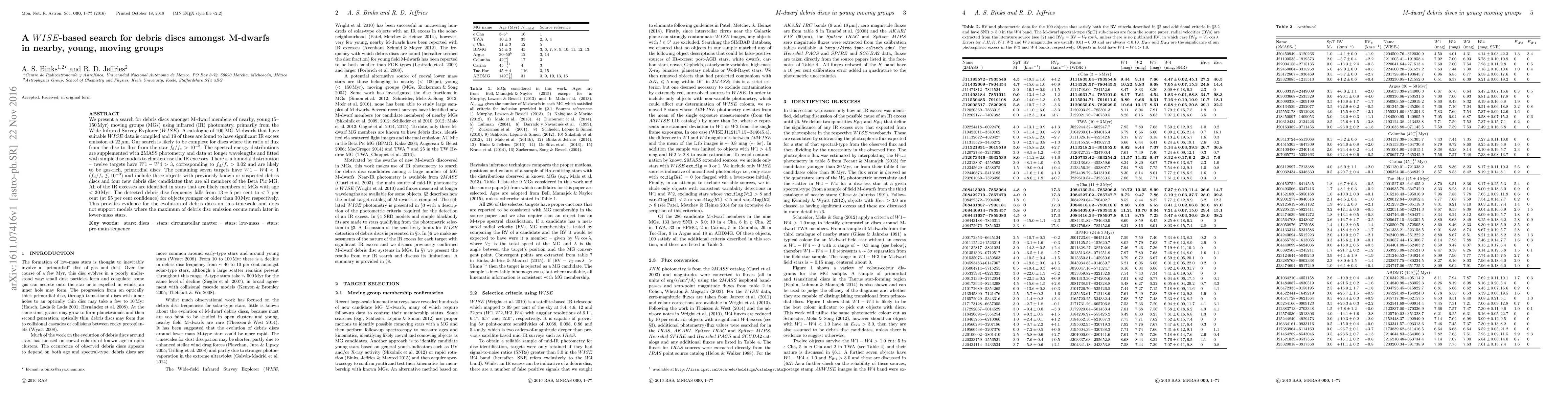 This study uses WISE infrared data to identify debris discs around M-dwarfs in young nearby moving groups, finding 19 discs with significant IR excess, including 12 gas-rich primordial discs and 7 debris disc candidates. The frequency of debris discs decreases with age, supporting their evolution within 30 Myr.