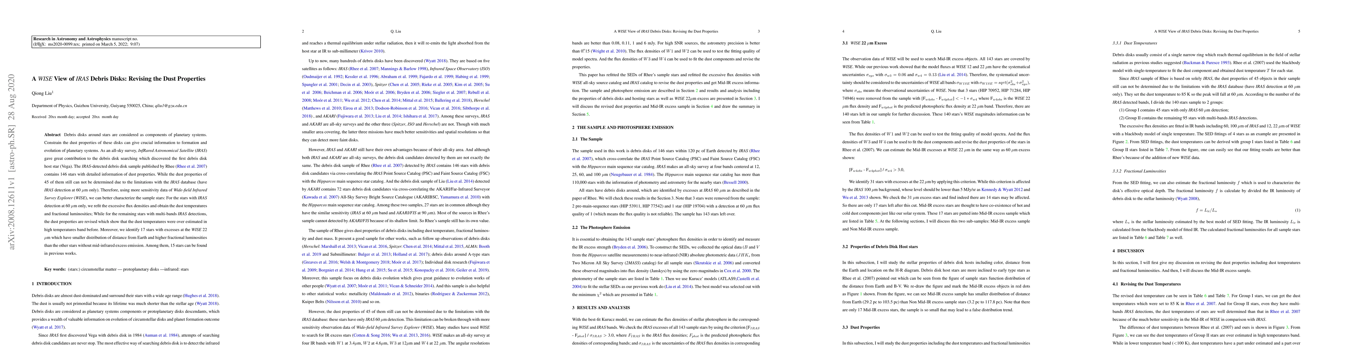 This paper revises the dust properties of IRAS-detected debris disks using data from the WISE survey, improving characterization for stars previously limited by the IRAS database. It finds that dust temperatures were overestimated in high-temperature bands and identifies 17 stars with mid-infrared excess emissions showing a smaller distance distribution and higher fractional luminosities.