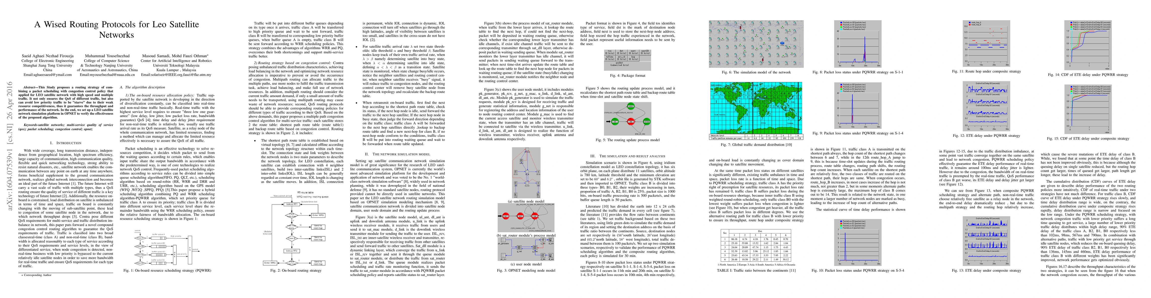 This paper proposes a combined packet scheduling and congestion control routing strategy for LEO satellite networks to ensure QoS and avoid low-priority traffic starvation, validated through a simulation platform in OPNET. The approach aims to enhance throughput and network performance under high-speed, multi-traffic conditions.