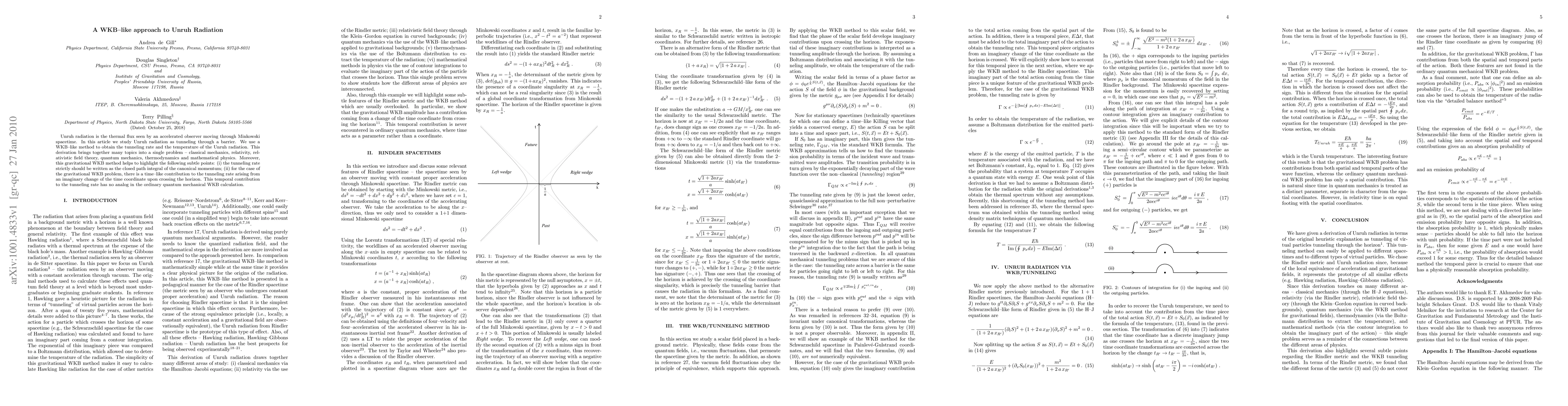 Unruh radiation is the thermal flux seen by an accelerated observer moving through Minkowski spacetime. In this article we study Unruh radiation as tunneling through a barrier. We use a WKB-like method to obtain the tunneling rate and the temperature of the Unruh radiation. This derivation brings together many topics into a single problem - classical mechanics, relativity, relativistic field theory, quantum mechanics, thermodynamics and mathematical physics. Moreover, this gravitational WKB method helps to highlight the following subtle points: (i) the tunneling rate strictly should be written as the closed path integral of the canonical momentum; (ii) for the case of the gravitational WKB problem, there is a time-like contribution to the tunneling rate arising from an imaginary change of the time coordinate upon crossing the horizon. This temporal contribution to the tunneling rate has no analog in the ordinary quantum mechanical WKB calculation.
