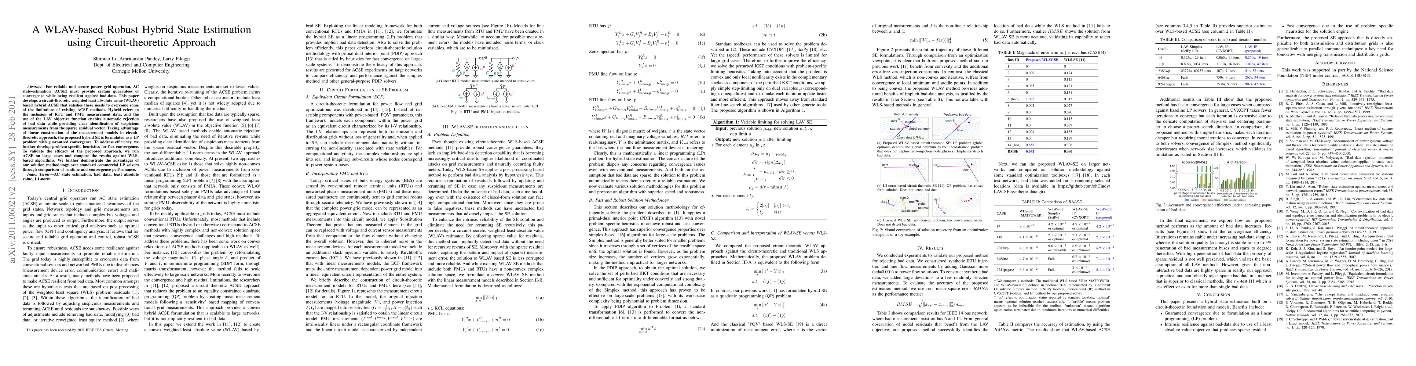 This paper proposes a WLAV-based hybrid AC state-estimation method using circuit-theoretic principles to ensure convergence and resilience against bad data. It combines RTU and PMU measurements, automatically rejects bad data, and formulates the problem as a linear programming (LP) problem for efficient convergence.