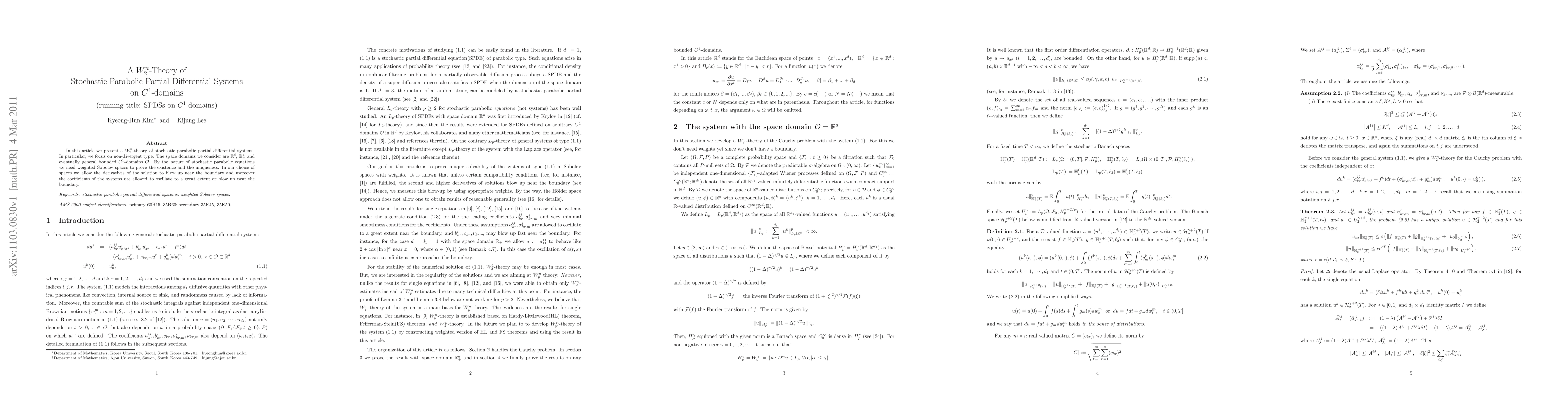 In this article we present a $W^n_2$-theory of stochastic parabolic partial differential systems. In particular, we focus on non-divergent type. The space domains we consider are $\bR^d$, $\bR^d_+$ and eventually general bounded $C^1$-domains $\mathcal{O}$. By the nature of stochastic parabolic equations we need weighted Sobolev spaces to prove the existence and the uniqueness. In our choice of spaces we allow the derivatives of the solution to blow up near the boundary and moreover the coefficients of the systems are allowed to oscillate to a great extent or blow up near the boundary.
