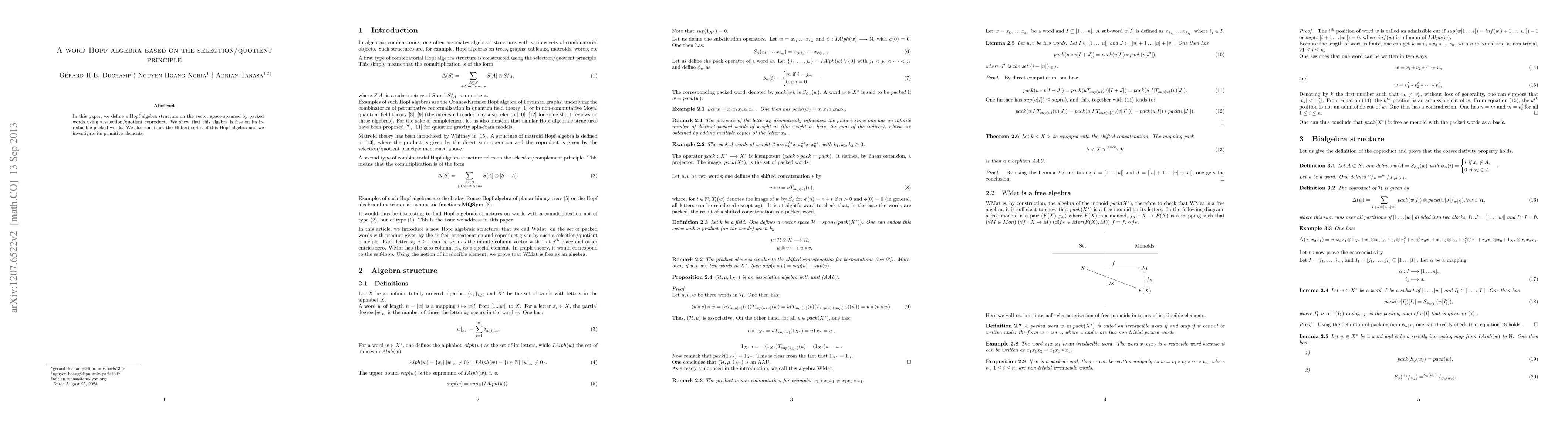 In this paper, we define a Hopf algebra structure on the vector space spanned by packed words using a selection/quotient coproduct. We show that this algebra is free on its irreducible packed words. We also construct the Hilbert series of this Hopf algebra and we investigate its primitive elements.