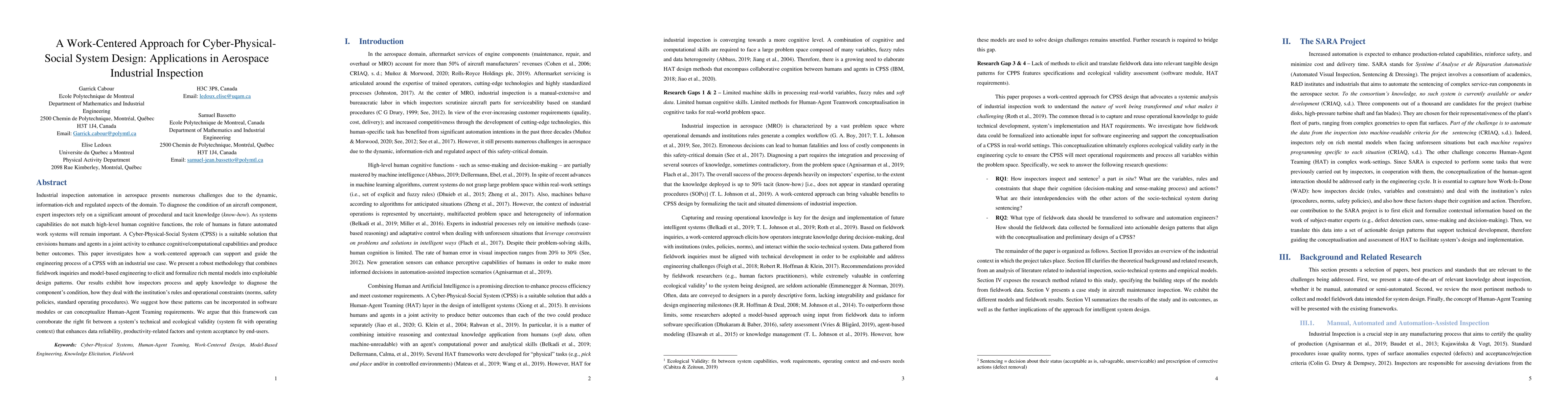 Industrial inspection automation in aerospace presents numerous challenges due to the dynamic, information-rich and regulated aspects of the domain. To diagnose the condition of an aircraft component, expert inspectors rely on a significant amount of procedural and tacit knowledge (know-how). As systems capabilities do not match high level human cognitive functions, the role of humans in future automated work systems will remain important. A Cyber-Physical-Social System (CPSS) is a suitable solution that envisions humans and agents in a joint activity to enhance cognitive/computational capabilities and produce better outcomes. This paper investigates how a work-centred approach can support and guide the engineering process of a CPSS with an industrial use case. We present a robust methodology that combines fieldwork inquiries and model-based engineering to elicit and formalize rich mental models into exploitable design patterns. Our results exhibit how inspectors process and apply knowledge to diagnose the component`s condition, how they deal with the institution`s rules and operational constraints (norms, safety policies, standard operating procedures). We suggest how these patterns can be incorporated in software modules or can conceptualize Human-Agent Teaming requirements. We argue that this framework can corroborate the right fit between a system`s technical and ecological validity (system fit with operating context) that enhances data reliability, productivity-related factors and system acceptance by end-users.