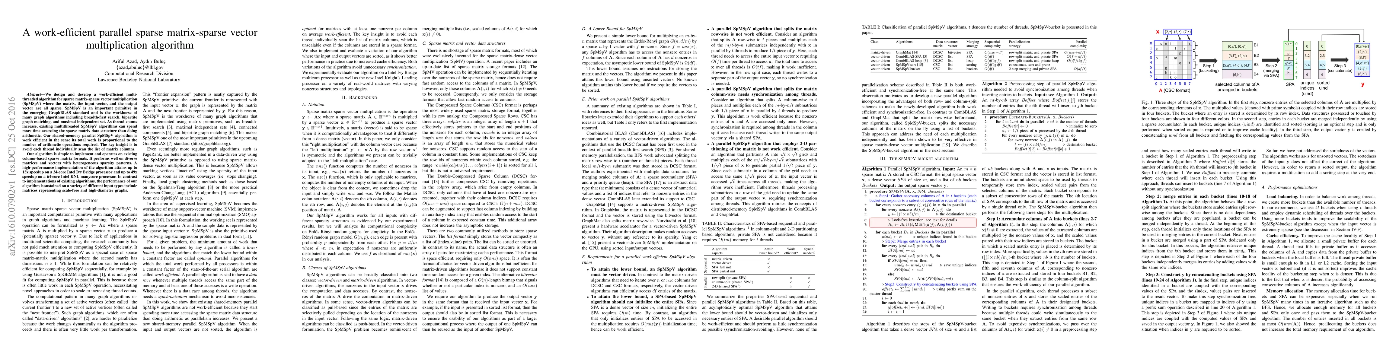This paper presents a work-efficient multithreaded algorithm for sparse matrix-sparse vector multiplication, achieving up to 15x speedup on 24-core processors and 49x on 64-core processors. The algorithm avoids individual thread scans of matrix columns, maintaining performance across diverse sparse data patterns.