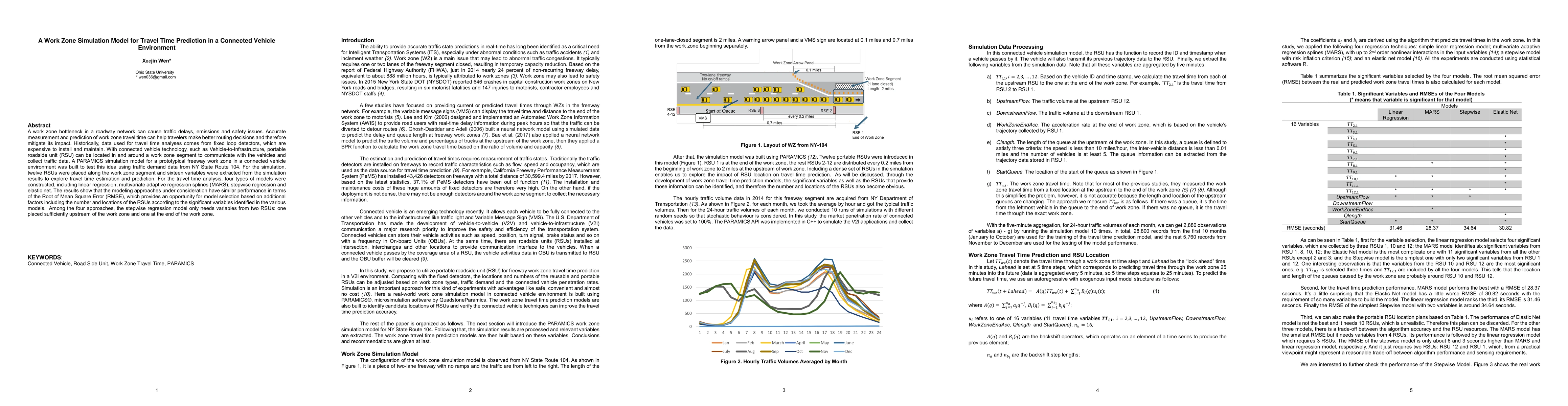This paper develops a PARAMICS simulation model to predict travel time in a connected vehicle environment during a work zone on NY State Route 104. The study compares four modeling approaches, finding similar performance in RMSE, with stepwise regression requiring data from just two strategically placed roadside units.