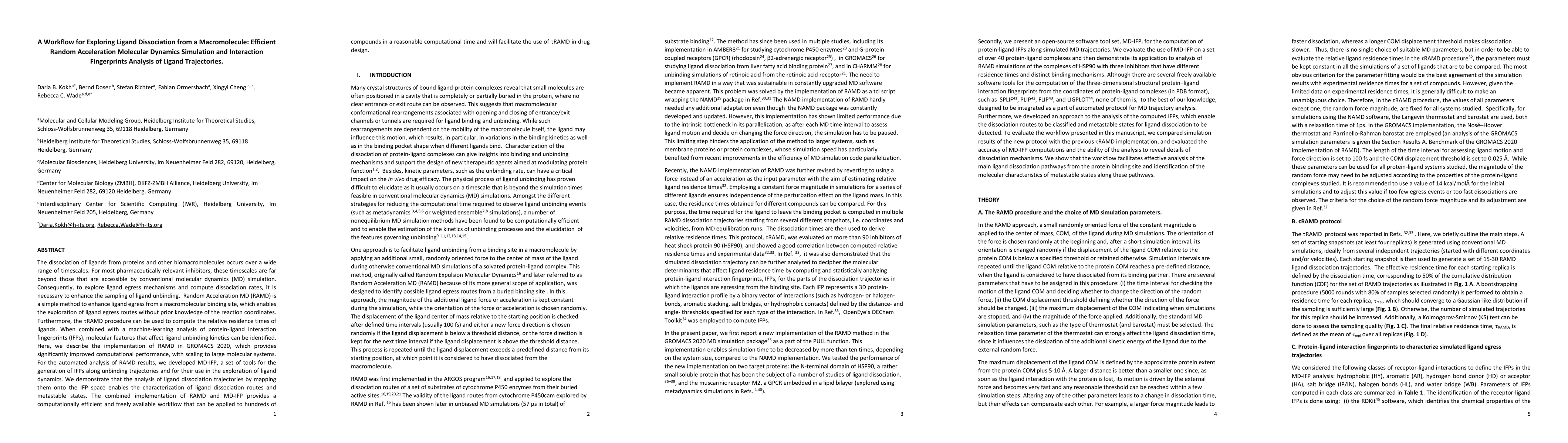 This paper presents a workflow combining Random Acceleration Molecular Dynamics (RAMD) and interaction fingerprint analysis to efficiently explore ligand dissociation from macromolecules. The RAMD method enhances sampling of ligand unbinding, while the MD-IFP tools facilitate the analysis of unbinding trajectories, identifying molecular features affecting dissociation kinetics.