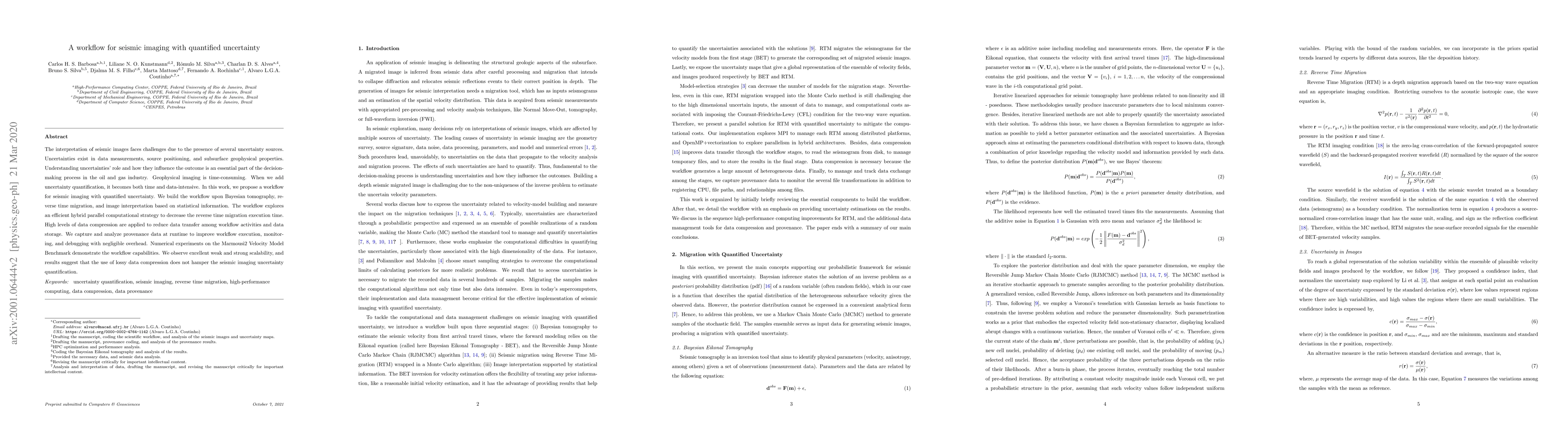 The interpretation of seismic images faces challenges due to the presence of several uncertainty sources. Uncertainties exist in data measurements, source positioning, and subsurface geophysical properties. Understanding uncertainties' role and how they influence the outcome is an essential part of the decision-making process in the oil and gas industry. Geophysical imaging is time-consuming. When we add uncertainty quantification, it becomes both time and data-intensive. In this work, we propose a workflow for seismic imaging with quantified uncertainty. We build the workflow upon Bayesian tomography, reverse time migration, and image interpretation based on statistical information. The workflow explores an efficient hybrid parallel computational strategy to decrease the reverse time migration execution time. High levels of data compression are applied to reduce data transfer among workflow activities and data storage. We capture and analyze provenance data at runtime to improve workflow execution, monitoring, and debugging with negligible overhead. Numerical experiments on the Marmousi2 Velocity Model Benchmark demonstrate the workflow capabilities. We observe excellent weak and strong scalability, and results suggest that the use of lossy data compression does not hamper the seismic imaging uncertainty quantification.