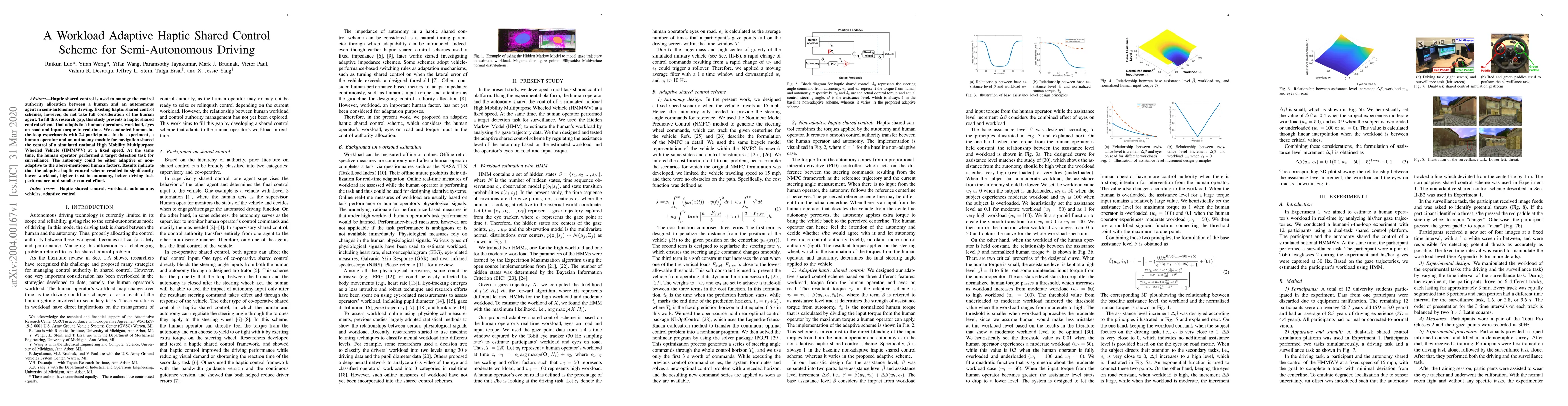 This study proposes a workload adaptive haptic shared control scheme for semi-autonomous driving that dynamically adjusts based on human operator factors, leading to lower workload, higher trust, better performance, and reduced control effort compared to non-adaptive schemes. Human-in-the-loop experiments with simulated driving tasks confirmed the benefits of the adaptive approach.