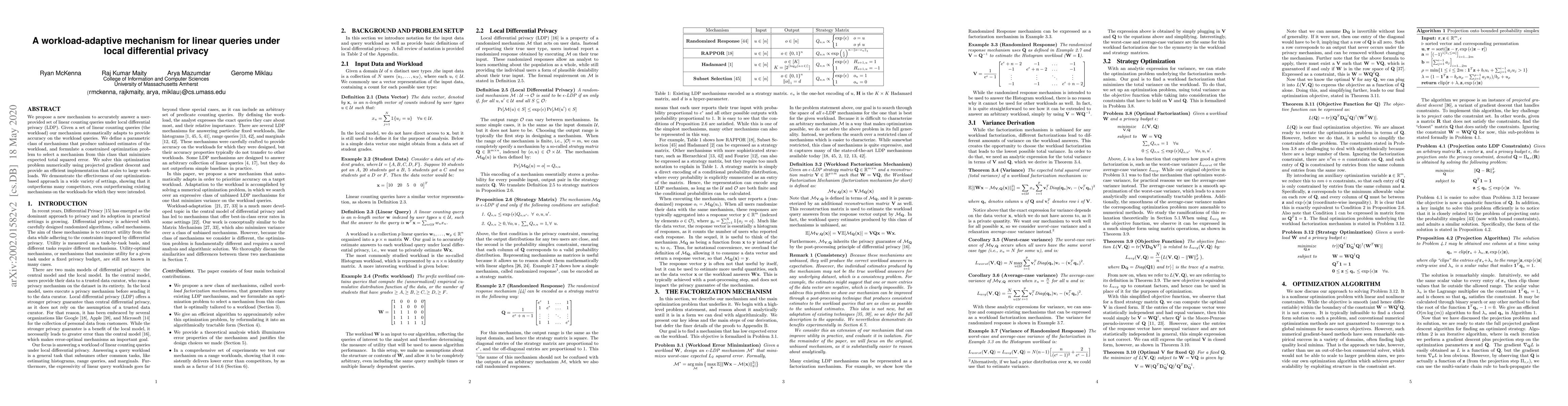 We propose a new mechanism to accurately answer a user-provided set of linear counting queries under local differential privacy (LDP). Given a set of linear counting queries (the workload) our mechanism automatically adapts to provide accuracy on the workload queries. We define a parametric class of mechanisms that produce unbiased estimates of the workload, and formulate a constrained optimization problem to select a mechanism from this class that minimizes expected total squared error. We solve this optimization problem numerically using projected gradient descent and provide an efficient implementation that scales to large workloads. We demonstrate the effectiveness of our optimization-based approach in a wide variety of settings, showing that it outperforms many competitors, even outperforming existing mechanisms on the workloads for which they were intended.