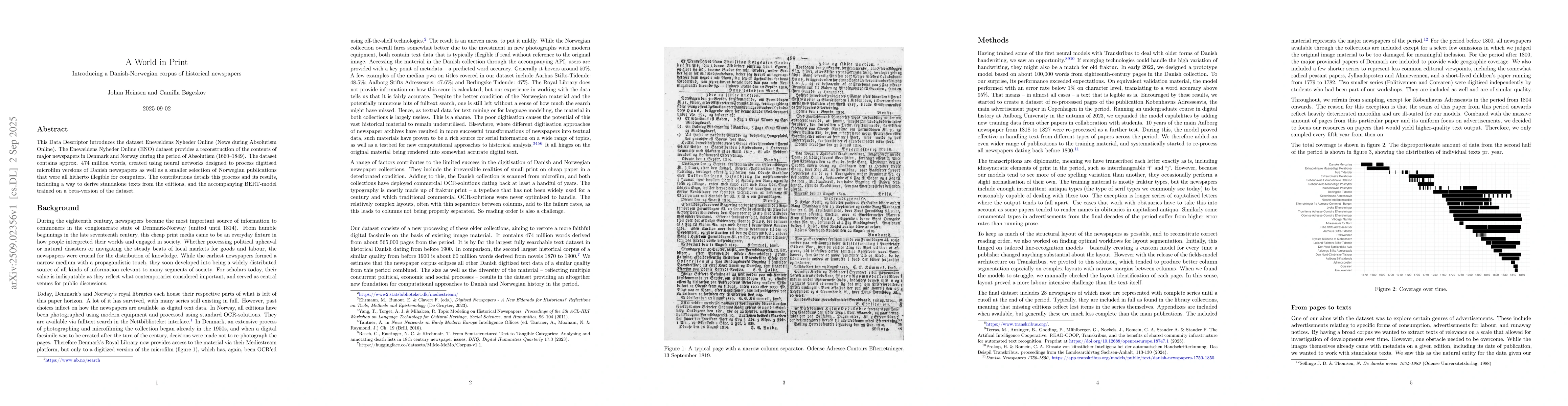 This Data Descriptor introduces the dataset Enevaeldens Nyheder Online (News during Absolutism Online). The Enevaeldens Nyheder Online (ENO) dataset provides a reconstruction of the contents of major newspapers in Denmark and Norway during the period of Absolutism (1660-1849). The dataset contains approx. 474 million words, created using neural networks designed to process digitised microfilm versions of Danish newspapers as well as a smaller selection of Norwegian publications that were all hitherto illegible for computers. The contributions details this process and its results, including a way to derive standalone texts from the editions, and the accompanying BERT-model trained on a beta-version of the dataset.