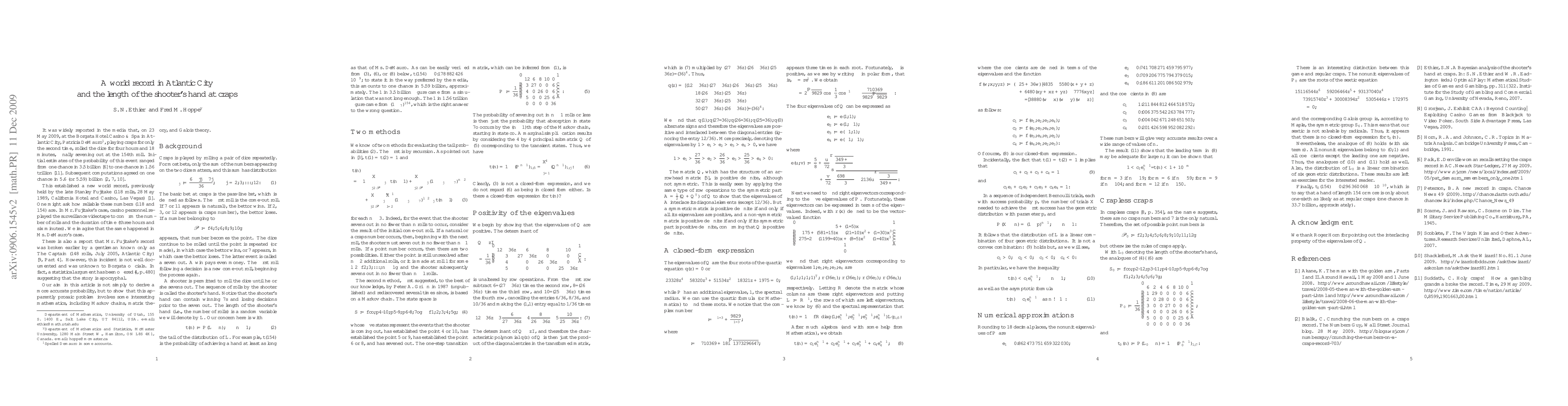 It was widely reported in the media that, on 23 May 2009, at the Borgata Hotel Casino & Spa in Atlantic City, Patricia DeMauro, playing craps for only the second time, rolled the dice for four hours and 18 minutes, finally sevening out at the 154th roll, a world record. Initial estimates of the probability of this event were erroneous, but consensus was reached within days: one chance in 5.6 billion. More generally, what is P(L \ge n), where the random variable L denotes the length of the shooter's hand (154 in Ms. DeMauro's case) and n is a positive integer? It is well known that these probabilities can be derived recursively or by Markov chain methods. Our aim here is to give an explicit closed-form expression for them, showing that the distribution of L is a linear combination (not a convex combination) of four geometric distributions.