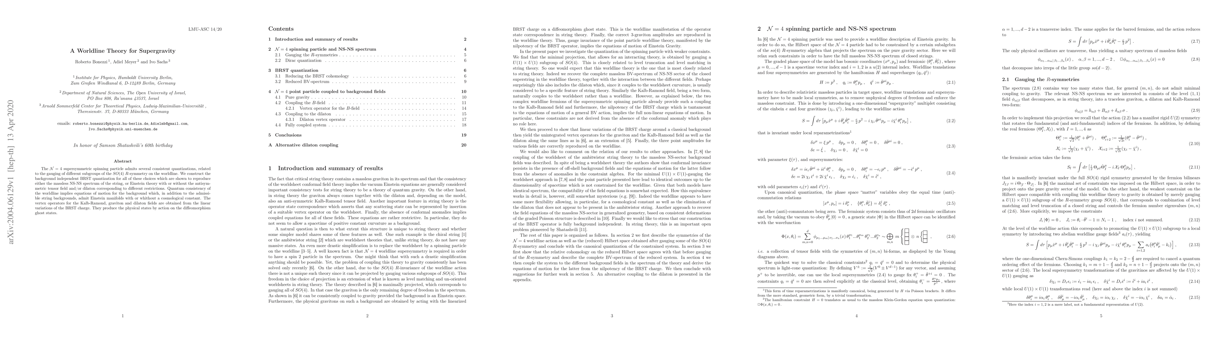 The $\cal{N}=4$ supersymmetric spinning particle admits several consistent quantizations, related to the gauging of different subgroups of the $SO(4)$ $R$-symmetry on the worldline. We construct the background independent BRST quantization for all of these choices which are shown to reproduce either the massless NS-NS spectrum of the string, or Einstein theory with or without the antisymmetric tensor field and/or dilaton corresponding to different restrictions. Quantum consistency of the worldline implies equations of motion for the background which, in addition to the admissible string backgrounds, admit Einstein manifolds with or whithout a cosmological constant. The vertex operators for the Kalb-Ramond, graviton and dilaton fields are obtained from the linear variations of the BRST charge. They produce the physical states by action on the diffeomorphism ghost states.