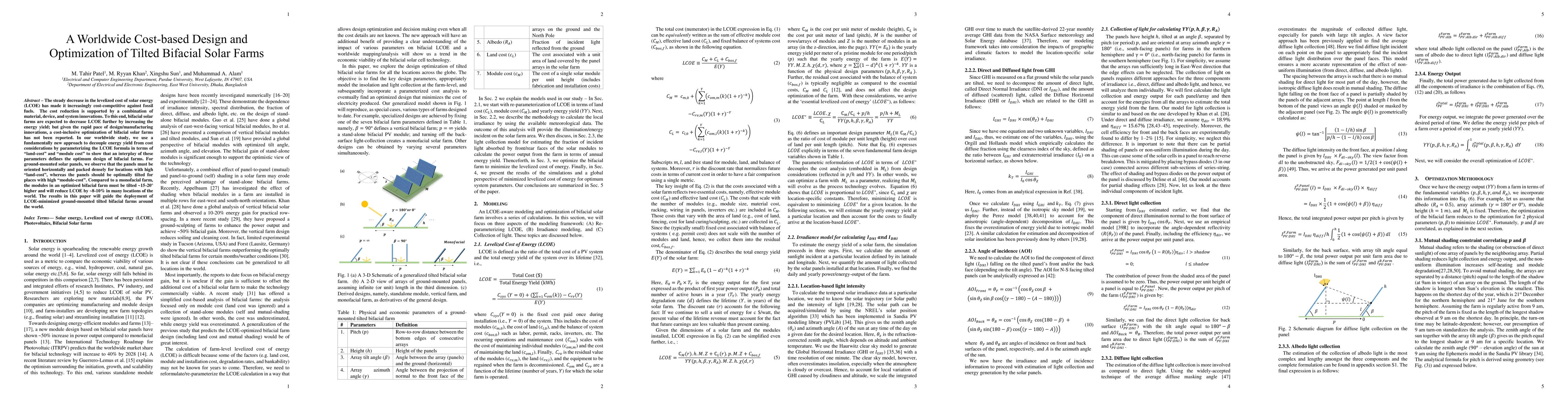 This study presents a new cost-based optimization approach for bifacial solar farms, demonstrating that the optimal design depends on balancing land and module costs. It finds that horizontal, densely packed panels are best for high land-cost locations, while optimal tilting is better for high module-cost areas, reducing LCOE by 8-10% compared to monofacial farms.