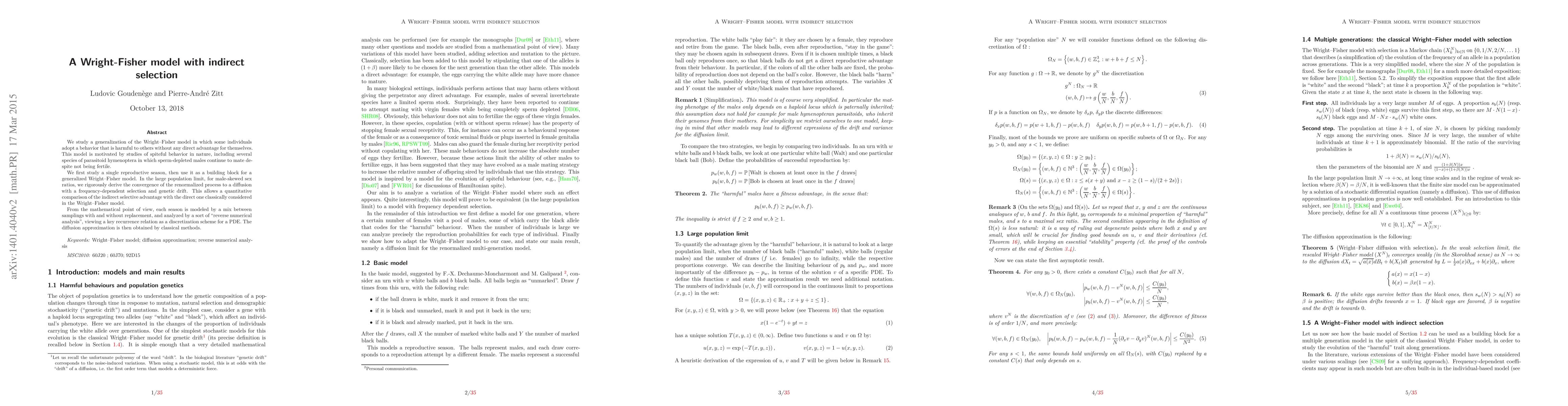 This paper generalizes the Wright-Fisher model to include indirect selection, focusing on spiteful behaviors without direct self-benefit. The study rigorously derives the convergence of the renormalized process to a diffusion in large populations, allowing for a quantitative comparison between indirect and direct selection.