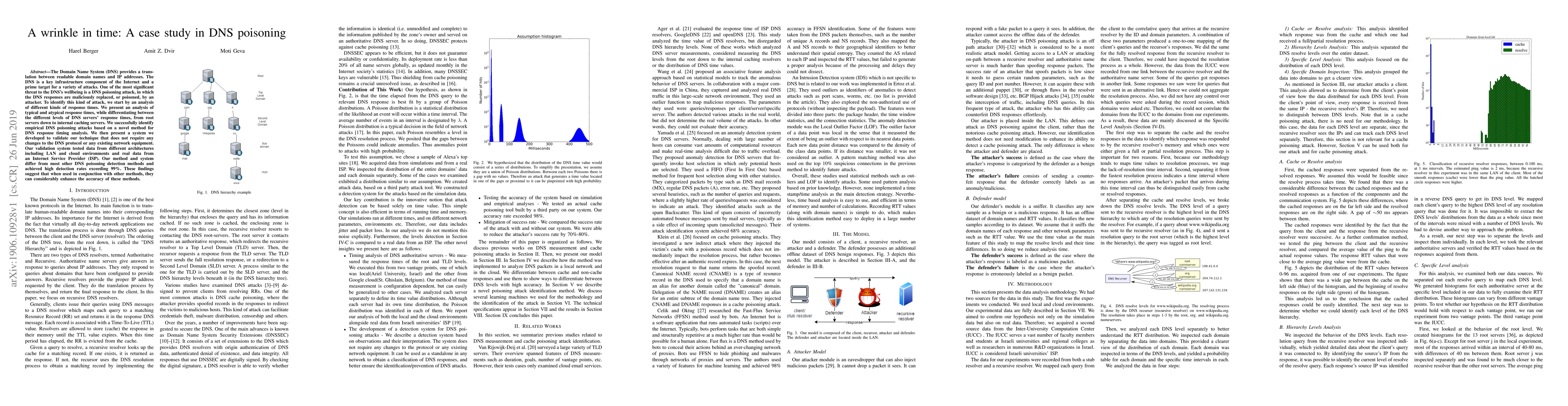 This paper investigates DNS poisoning attacks by analyzing DNS response times across different server levels. The authors propose a novel method for detecting such attacks based on timing analysis, achieving over 99% detection accuracy, and demonstrate its effectiveness through a system validated in various network environments.