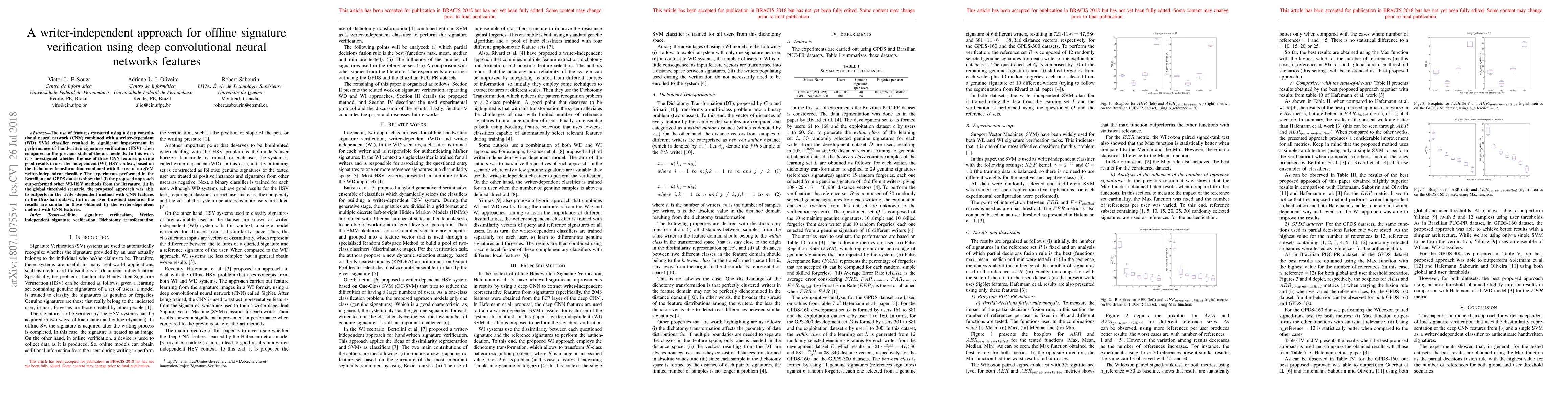 This paper proposes a writer-independent offline signature verification method using deep convolutional neural network features and an SVM classifier, achieving superior performance compared to existing writer-independent methods, and outperforming a writer-dependent CNN-SVM method in certain scenarios.