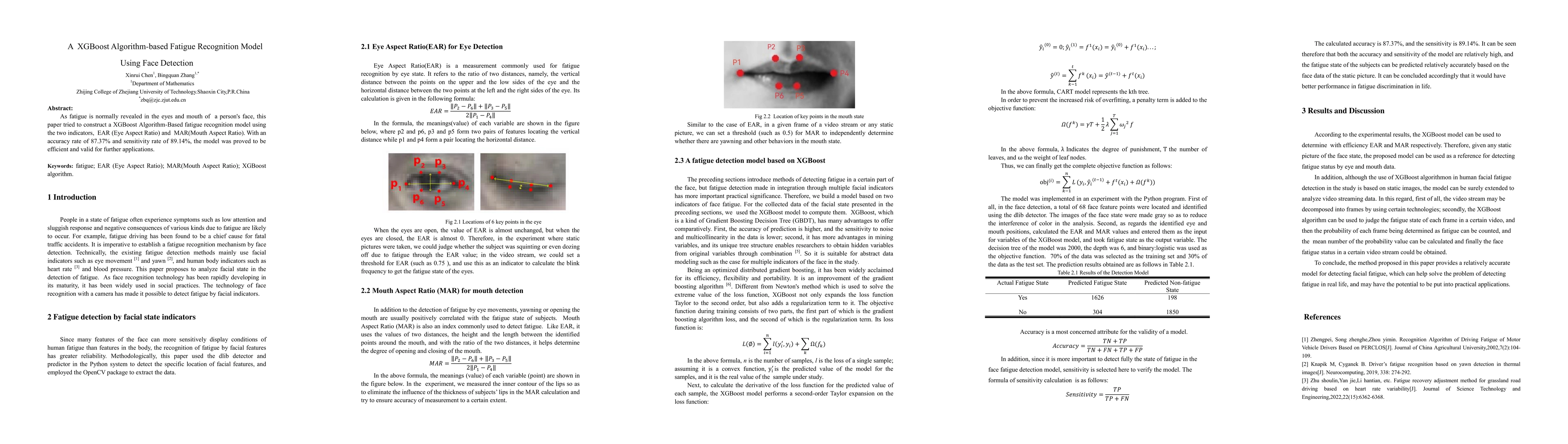 This paper develops a fatigue recognition model using XGBoost algorithm and face detection, focusing on EAR and MAR indicators. The model achieves an 87.37% accuracy and 89.14% sensitivity, demonstrating its efficiency and validity.