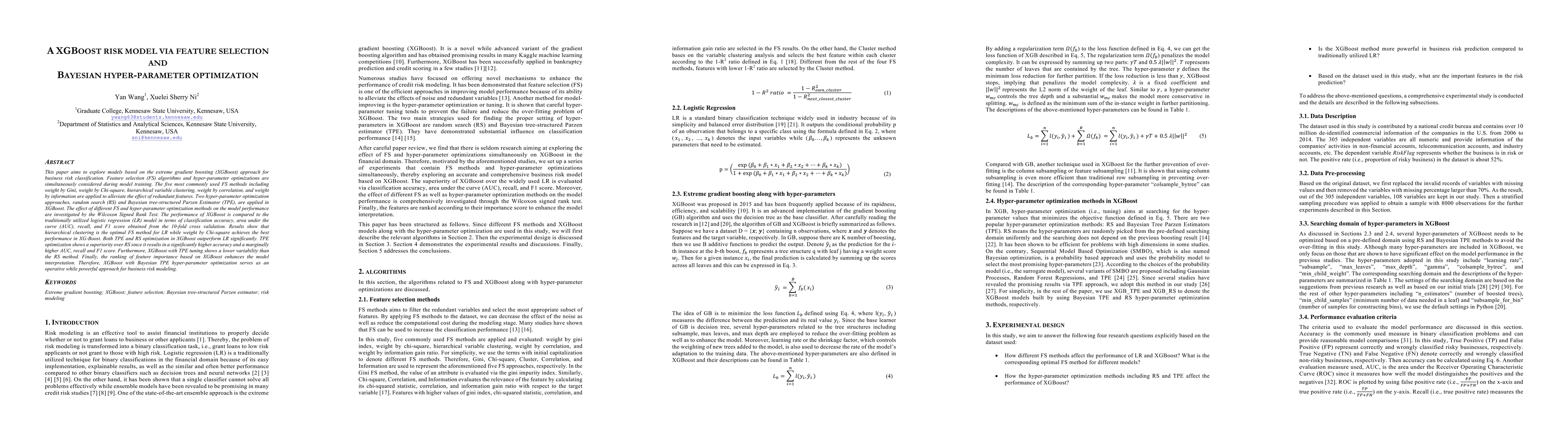 This paper develops an XGBoost risk model using feature selection and Bayesian hyper-parameter optimization, showing superior performance over logistic regression in terms of accuracy, AUC, recall, and F1 score. Bayesian optimization notably outperforms random search, providing more stable and higher-performing results.