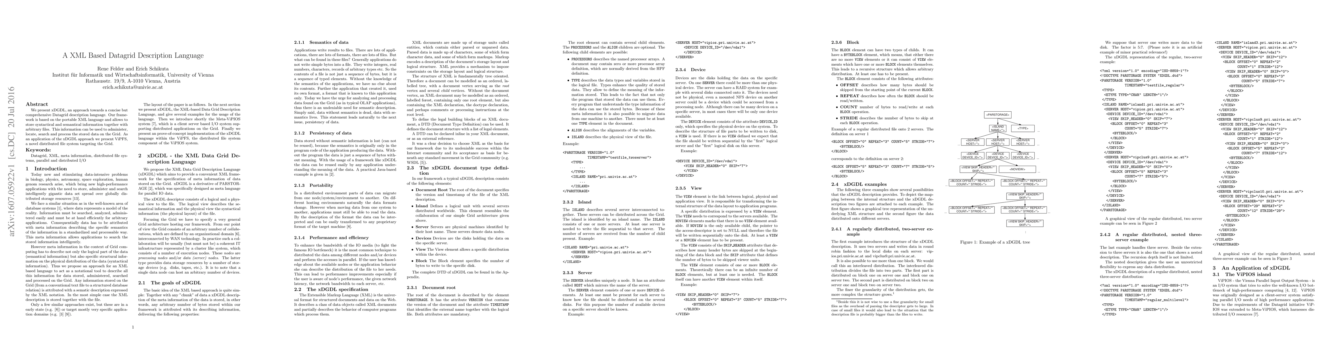 We present xDGDL, an approach towards a concise but comprehensive Datagrid description language. Our framework is based on the portable XML language and allows to store syntactical and semantical information together with arbitrary files. This information can be used to administer, locate, search and process the stored data on the Grid. As an application of the xDGDL approach we present ViPFS, a novel distributed file system targeting the Grid.