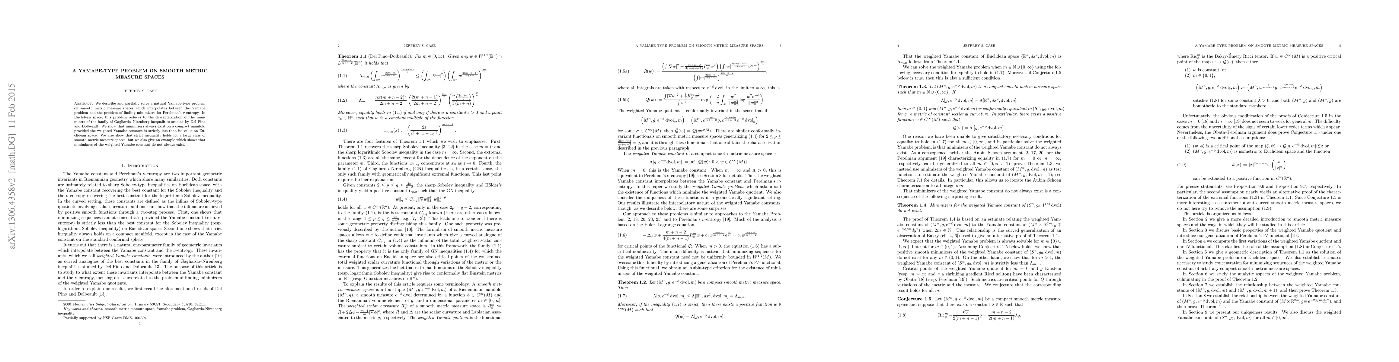 We describe and partially solve a natural Yamabe-type problem on smooth metric measure spaces which interpolates between the Yamabe problem and the problem of finding minimizers for Perelman's $\nu$-entropy. This problem reduces in all dimensions on Euclidean space to the characterization of the minimizers of the family of Gagliardo--Nirenberg--Sobolev inequalities studied by Del Pino and Dolbeault. We show that minimizers always exist on a compact manifold provided the so-called weighted Yamabe constant is strictly less than its value on Euclidean space. We also show that strict inequality holds for a large class of smooth metric measure spaces, but we will also give an example which shows that minimizers of the weighted Yamabe constant do not always exist.