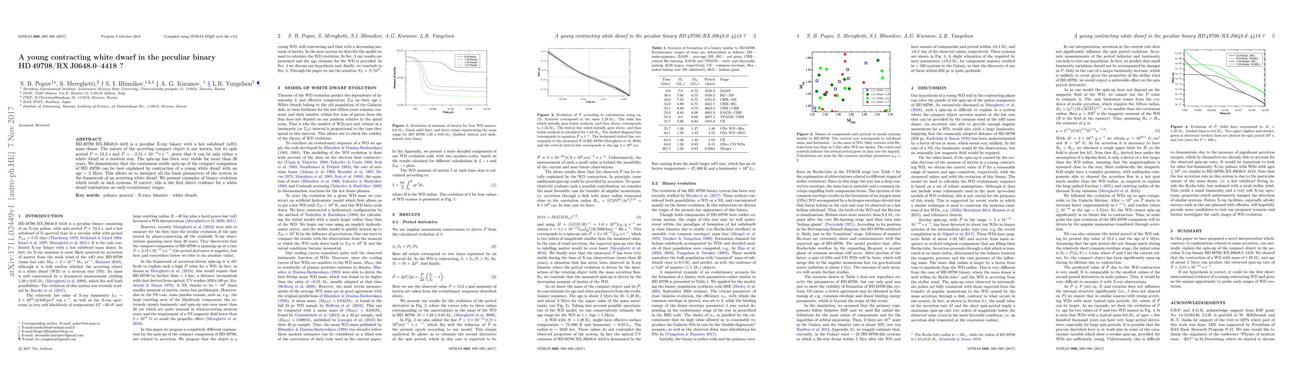 This paper investigates the peculiar X-ray binary HD 49798/RX J0648.0--4418, suggesting that the compact object is a young contracting white dwarf with an age of about 2 million years, based on its stable spin-up over 20 years. This finding provides the first direct evidence for white dwarf contraction in early evolutionary stages.