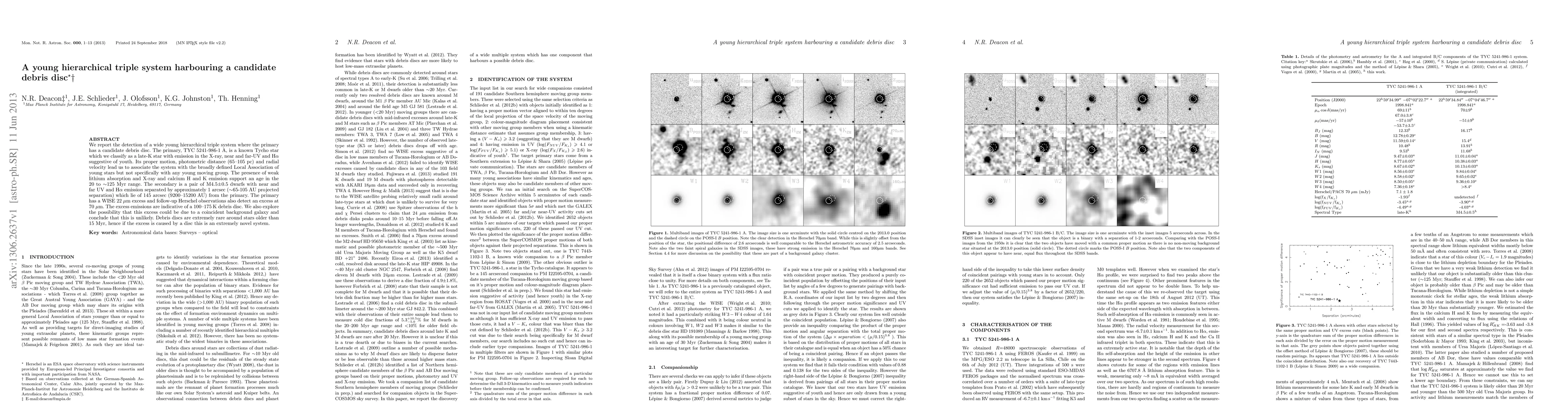 We report the detection of a wide young hierarchical triple system where the primary has a candidate debris disc. The primary, TYC 5241-986-1 A, is a known Tycho star which we classify as a late-K star with emission in the X-ray, near and far-UV and H\alpha\ suggestive of youth. Its proper motion, photometric distance (65-105 pc) and radial velocity lead us to associate the system with the broadly defined Local Association of young stars but not specifically with any young moving group. The presence of weak lithium absorption and X-ray and calcium H and K emission support an age in the 20 to ~125 Myr range. The secondary is a pair of M4.5+-0.5 dwarfs with near and far UV and H\alpha\ emission separated by approximately 1 arcsec (~65-105 AU projected separation) which lie 145 arcsec (9200-15200 AU) from the primary. The primary has a WISE 22 micron excess and follow-up Herschel observations also detect an excess at 70 micron. The excess emissions are indicative of a 100-175 K debris disc. We also explore the possibility that this excess could be due to a coincident background galaxy and conclude that this is unlikely. Debris discs are extremely rare around stars older than 15 Myr, hence if the excess is caused by a disc this is an extremely novel system.
