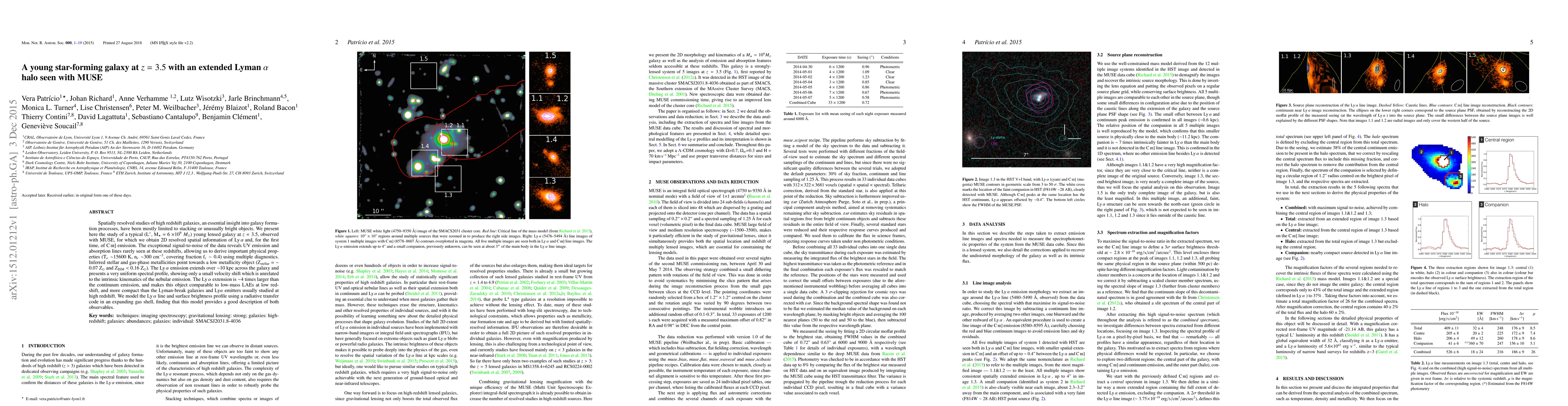 This paper presents a spatially resolved study of a typical young, lensed star-forming galaxy at z = 3.5 using MUSE, revealing an extended Ly$\alpha$ halo and CIII] emission. The study finds a low metallicity, uniform Ly$\alpha$ emission extending over 10 kpc, and models the observed line and profile with a radiative transfer code in an expanding gas shell.