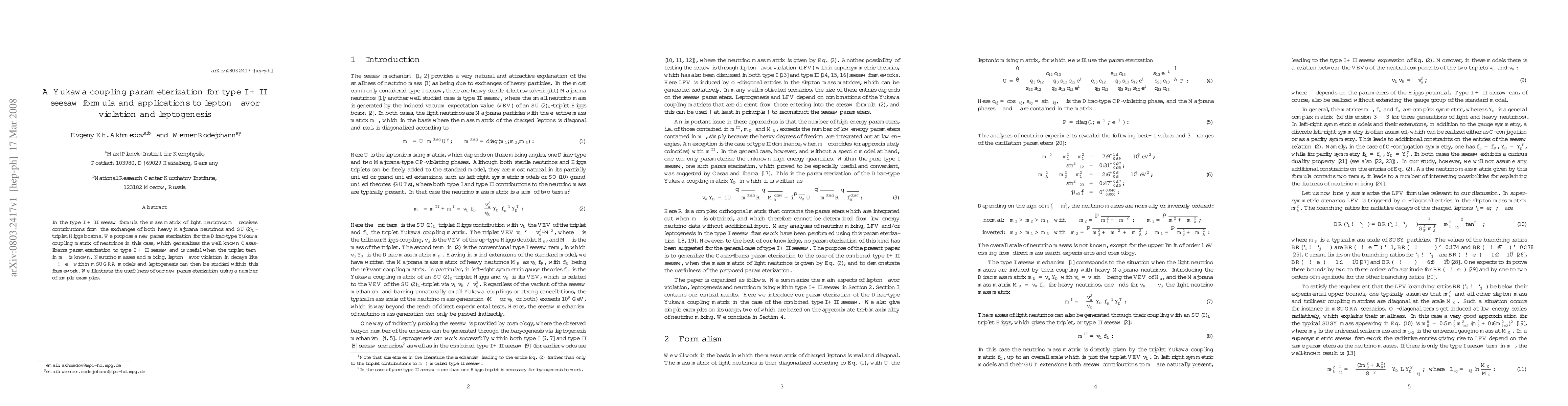 This paper proposes a new parameterization for the Dirac-type Yukawa coupling matrix in the type I + II seesaw framework, extending the Casas-Ibarra parameterization. It applies this framework to study lepton flavor violation and leptogenesis in mSUGRA models.