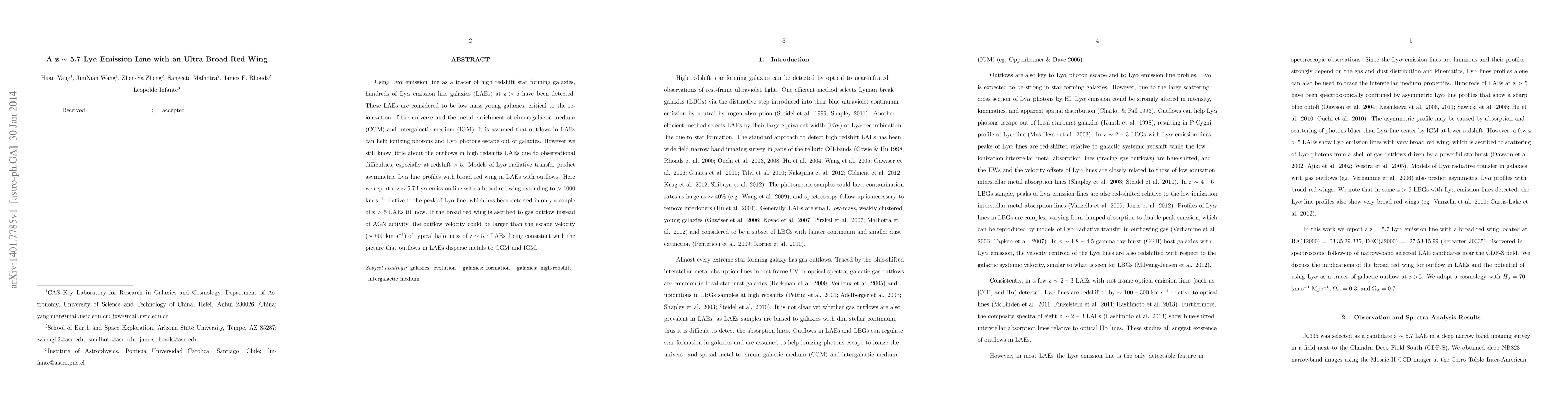 This paper reports the detection of a z ~ 5.7 Ly{\alpha} emission line with an ultra-broad red wing, indicative of gas outflows in a high-redshift star-forming galaxy. The broad red wing suggests outflow velocities exceeding typical escape velocities, supporting the role of outflows in dispersing metals into the circumgalactic and intergalactic medium.