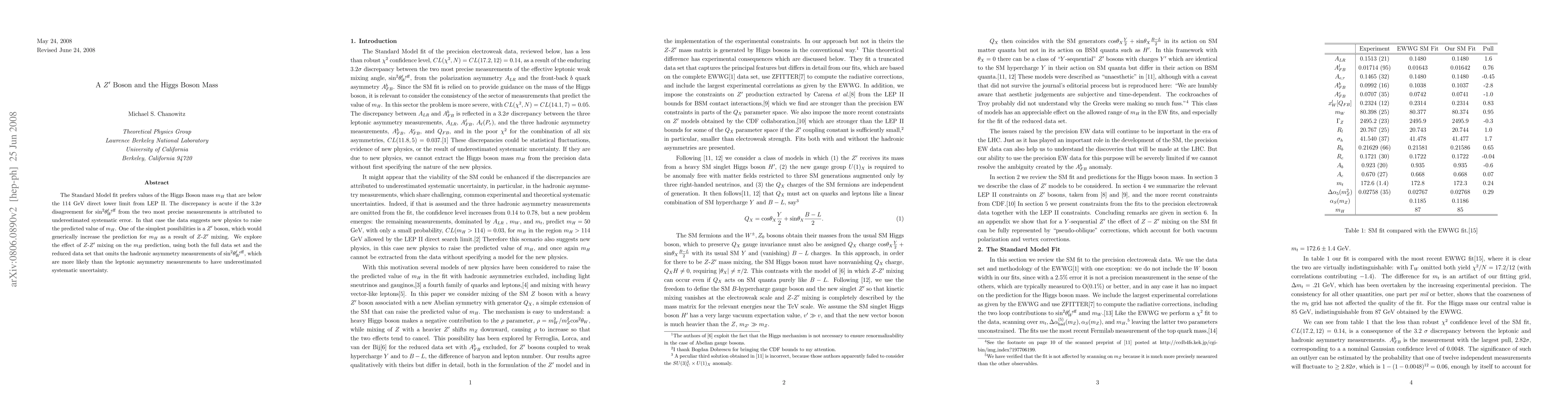 The Standard Model fit prefers values of the Higgs boson mass that are below the 114 GeV direct lower limit from LEP II. The discrepancy is acute if the 3.2 sigma disagreement for the effective weak interaction mixing angle from the two most precise measurements is attributed to underestimated systematic error. In that case the data suggests new physics to raise the predicted value of the Higgs mass. One of the simplest possibilities is a Z' boson, which would generically increase the prediction for the Higgs mass as a result of Z-Z' mixing. We explore the effect of Z-Z' mixing on the Higgs mass prediction, using both the full data set and the reduced data set that omits the hadronic asymmetry measurements of the weak mixing angle, which are more likely than the leptonic asymmetry measurements to have underestimated systematic uncertainty.