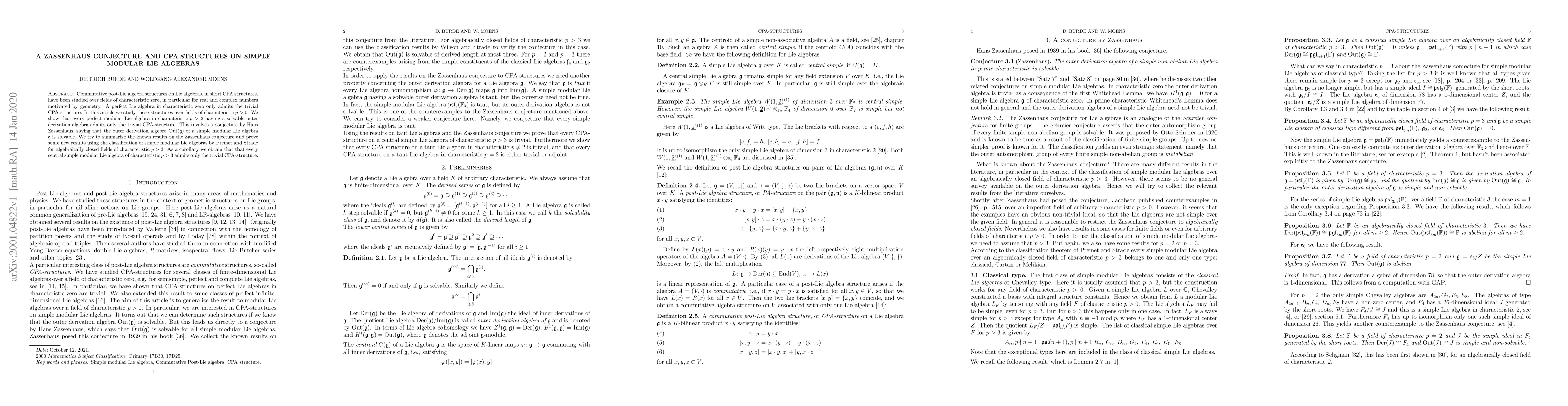 Commutative post-Lie algebra structures on Lie algebras, in short CPA structures, have been studied over fields of characteristic zero, in particular for real and complex numbers motivated by geometry. A perfect Lie algebra in characteristic zero only admits the trivial CPA-structure. In this article we study these structures over fields of characteristic $p>0$. We show that every perfect modular Lie algebra in characteristic $p>2$ having a solvable outer derivation algebra admits only the trivial CPA-structure. This involves a conjecture by Hans Zassenhaus, saying that the outer derivation algebra ${\rm Out}(\mathfrak{g})$ of a simple modular Lie algebra $\mathfrak{g}$ is solvable. We try to summarize the known results on the Zassenhaus conjecture and prove some new results using the classification of simple modular Lie algebras by Premet and Strade for algebraically closed fields of characteristic $p>3$. As a corollary we obtain that that every central simple modular Lie algebra of characteristic $p>3$ admits only the trivial CPA-structure.