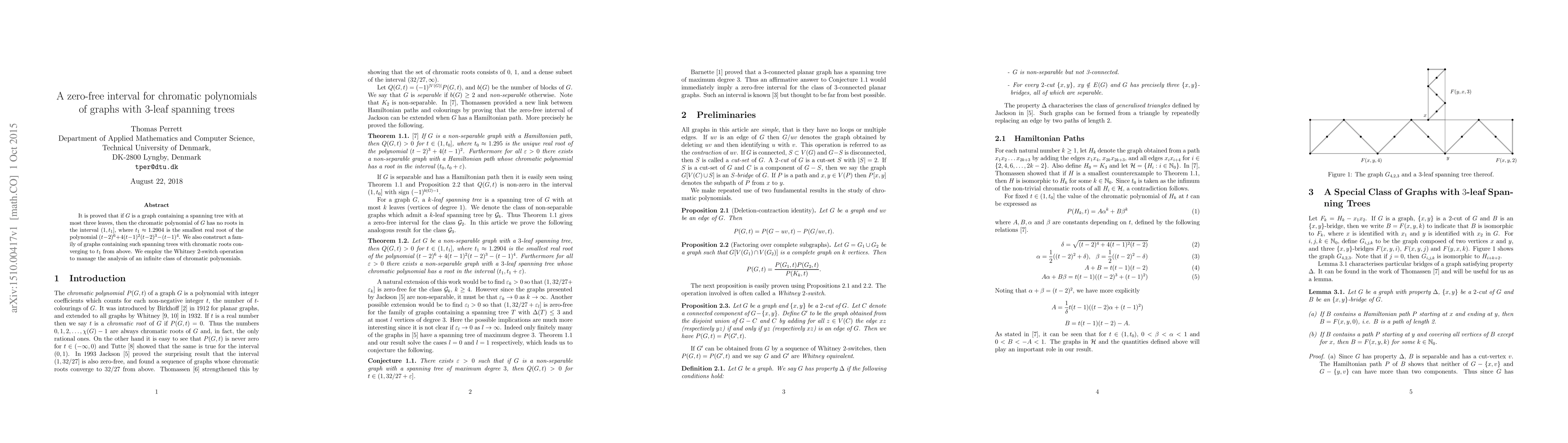 A graph with a 3-leaf spanning tree has a chromatic polynomial with no roots in the interval (1, t1], where t1 is approximately 1.2904. This implies that such graphs require at least 2 colors to color.