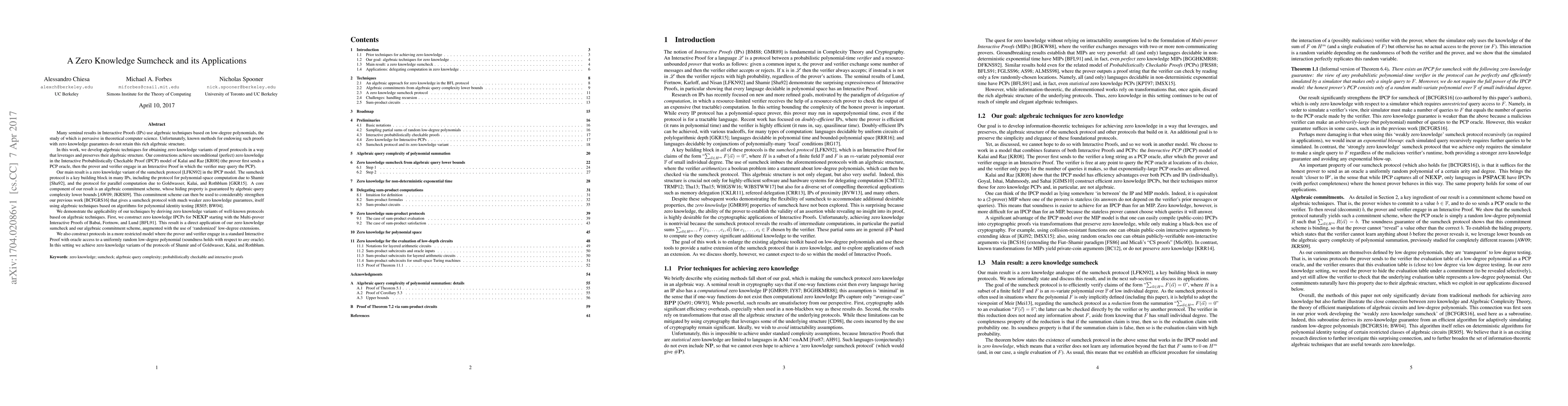 This paper develops algebraic techniques to create zero knowledge variants of proof protocols that preserve their algebraic structure, achieving unconditional zero knowledge in the IPCP model. The main result is a zero knowledge sumcheck protocol, which is crucial for polynomial-space and parallel computation protocols, utilizing an algebraic commitment scheme for enhanced security.