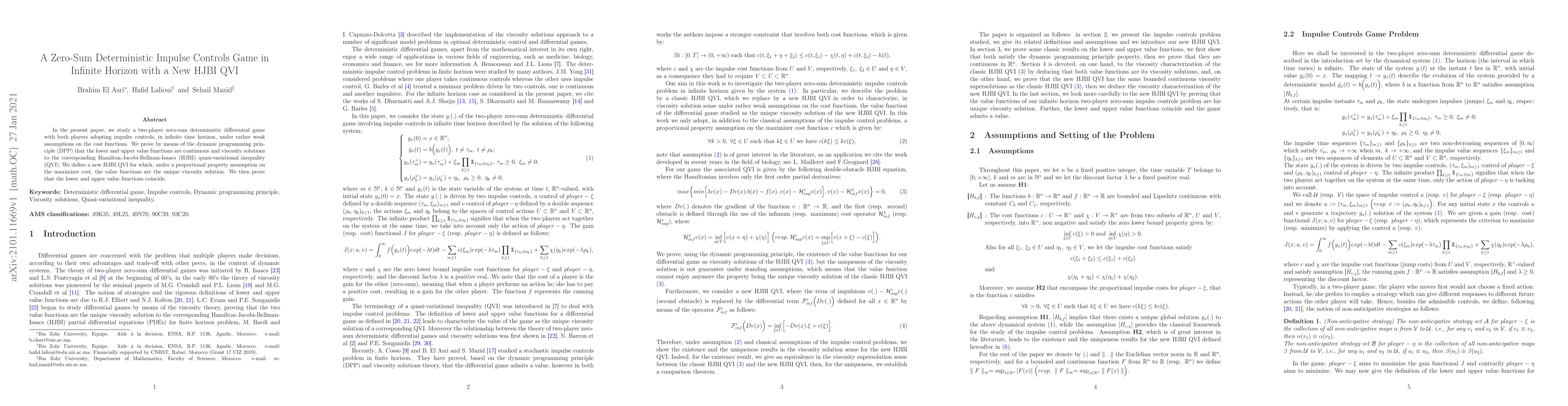 This paper investigates a two-player zero-sum deterministic impulse control game with an infinite horizon, proving continuity and viscosity solution properties for the lower and upper value functions via the dynamic programming principle. It introduces a new Hamilton-Jacobi-Bellman-Isaacs quasi-variational inequality (HJBI QVI) under which the value functions are unique and coincide.