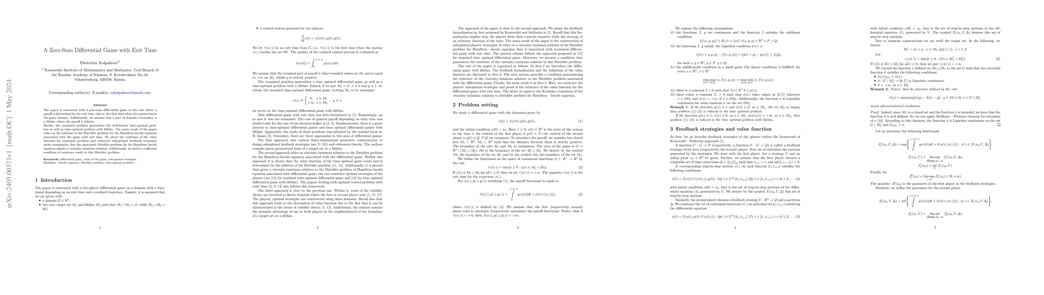The paper is concerned with a zero-sum differential game in the case where a payoff is determined by the exit time, that is, the first time when the system leaves the game domain. Additionally, we assume that a part of domain's boundary is a lifeline where the payoff is infinite. Hereby, the examined problem generalizes the well-known time-optimal problem as well as time-optimal problem with lifeline. The main result of the paper relies on the solution to the Direchlet problem for the Hamilton-Jacobi equation associated with the game with exit time. We prove the existence of the value function for examined problem and construct suboptimal feedback strategies under assumption that the associated Dirichlet problem for the Hamilton-Jacobi equation admits a viscosity/minimax solution. Additionally, we derive a sufficient condition of existence result to this Dirichlet problem.